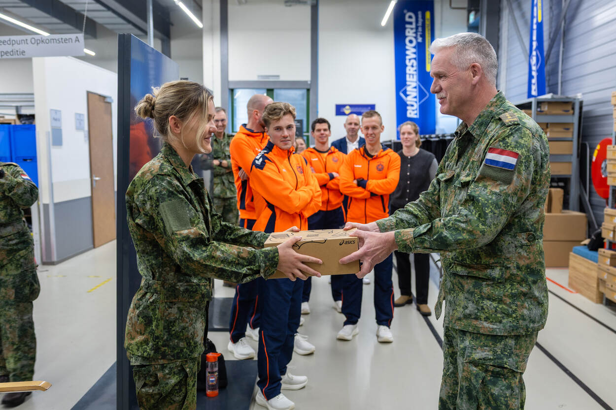 De commandant KPU-bedrijf, kolonel Jan Vonk, draagt het eerste paar sportschoenen over aan aankomend onderofficier Tessa. Op de achtergrond kijkt de militaire atletiekploeg toe.