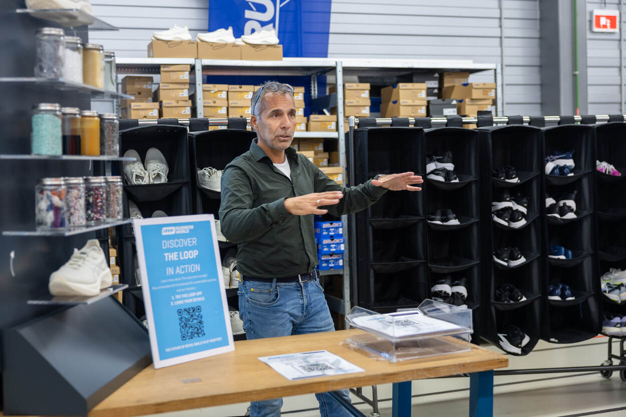 Een man met grijze haren en groene trui staat te praten in een schoenenwinkel, wijst naar rekken met sportschoenen en een bord met "Discover The Loop in Action" en een QR-code.