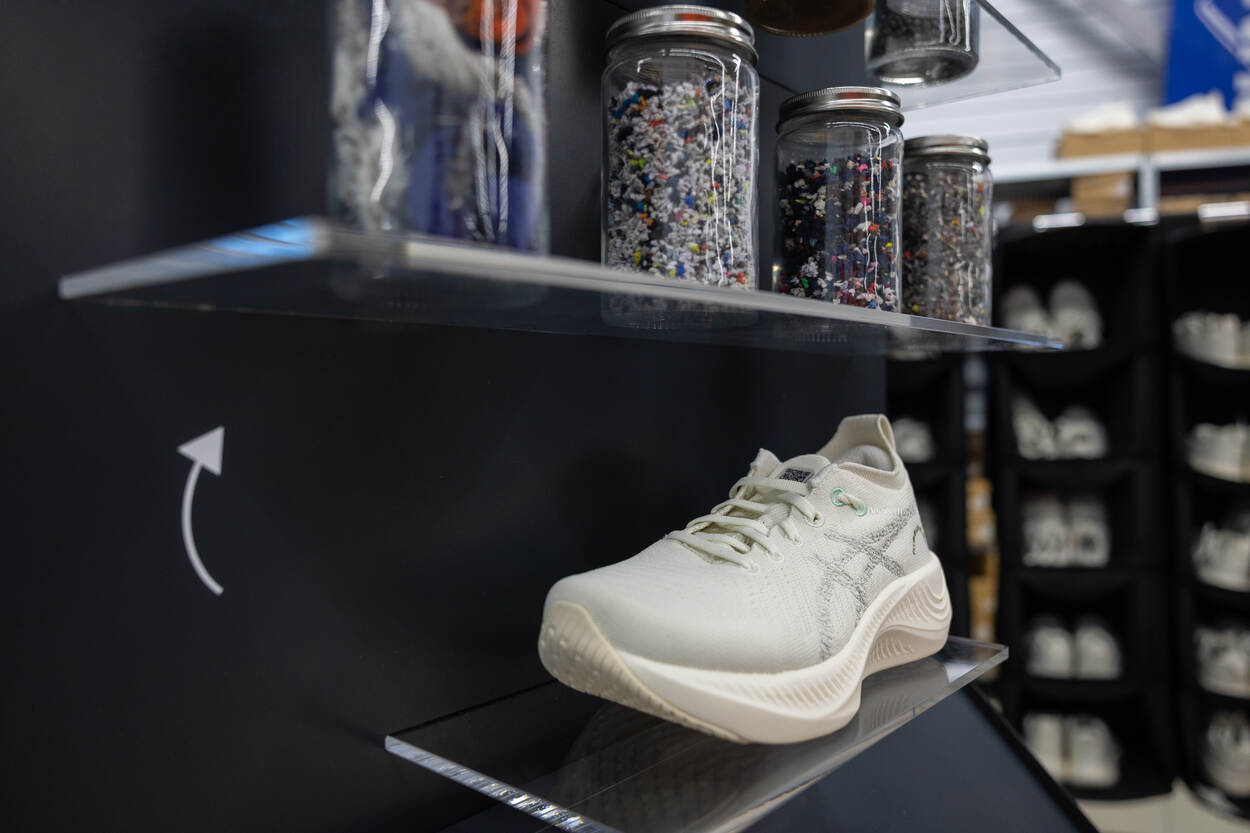 De witte sportschoenen die nu in het assortiment van het KPU-bedrijf komen, zijn van de merken Puma en ASICS. Dat laatste bedrijf heeft in Portugal een fabriek in gebruik genomen om de gebruikte materialen te verwerken tot nieuwe schoenen. “Een van onze eisen is dat de grondstoffen voor hergebruik geen wereldreis maken. Anders behaal je nog geen milieuwinst”, legt overste Eefting uit. Maar minstens zo belangrijk is de kwaliteit. “In eerste instantie was ‘onze’ schoen te zwaar; meer dan het maximale gewicht van driehonderd gram. Dat is trouwens geen verloren project geweest, want hieruit is de populaire sneaker Neocurve ontstaan (winnaar van innovatieprijs 2025 van Time Magazine, red.). Een bekende Nederlandse warenhuisketen verkoopt ze en dat loopt goed. Letterlijk ook dus.”