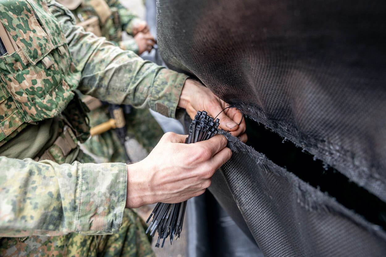 Links een close-up van handen die tie-wraps bevestigen. Rechts twee militairen die een zwart zeildoek spannen.