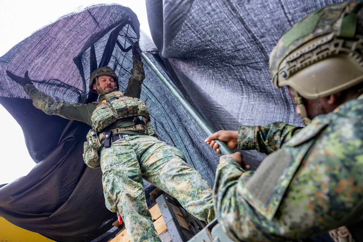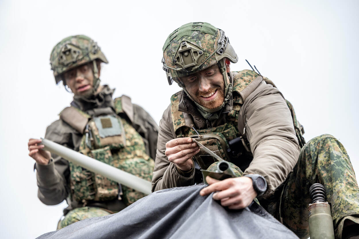 In het Limburgse Ysselsteyn staan afgelopen woensdag op het voormalig mobilisatiecomplex meerdere Scania’s verdekt opgesteld. Militairen zijn druk bezig om de voertuigen te camoufleren. Ze zijn druk in de weer met grote lappen zwart zeildoek, tie-wraps, lange palen en scheerlijnen. “Eigenlijk willen we simuleren dat het een aanbouw is”, legt Melvin uit. Daarin staan dan weer de Scania’s. Niet meteen zichtbaar, zeker niet vanuit de lucht. “Een overvliegende drone ziet ze niet. Maar ze staan er dus wel.”