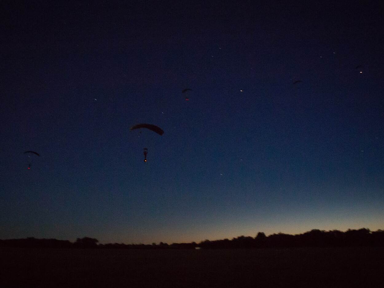 Parachutisten zweven in de schemerige avondlucht, hoog boven een donker landschap met enkele lichtjes en een geleidelijk lichter wordende horizon.