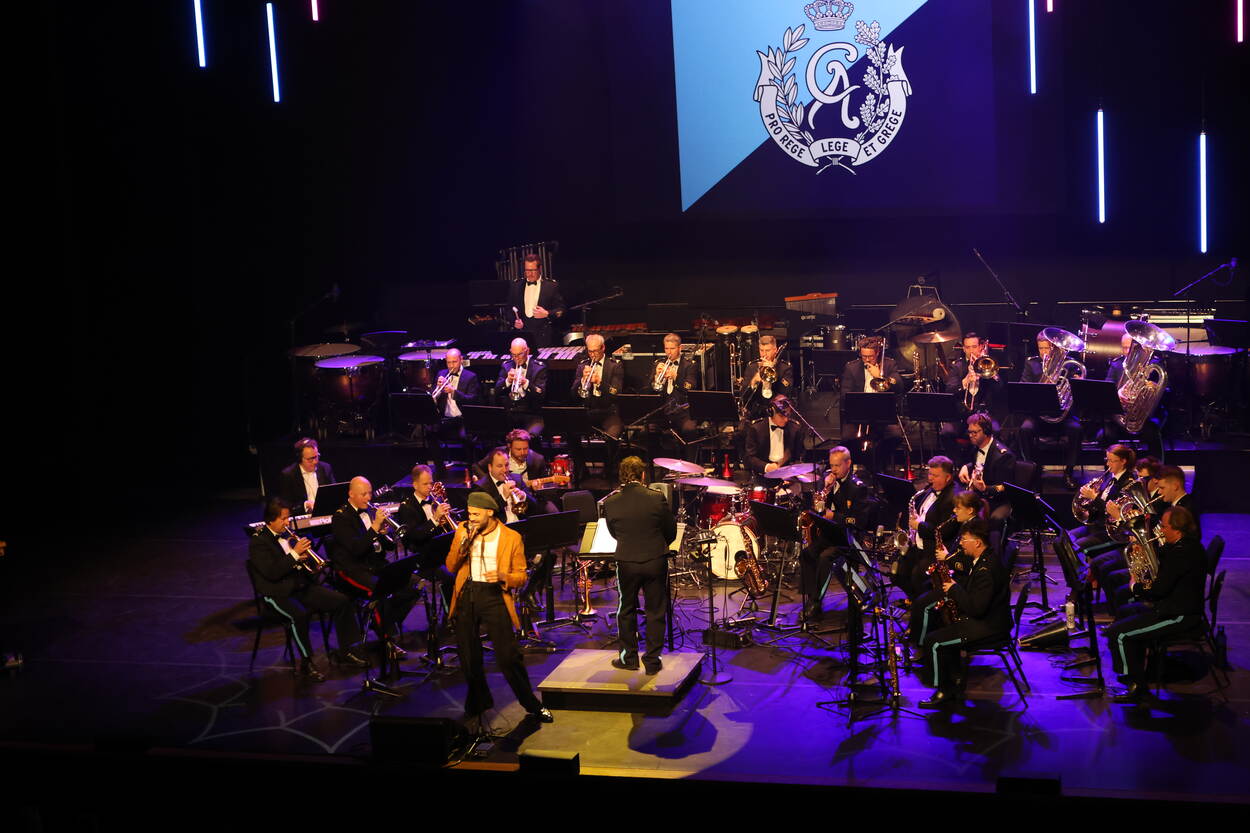 Op de voorgrond een zanger, met achter zich diverse muzikanten op een donker podium.