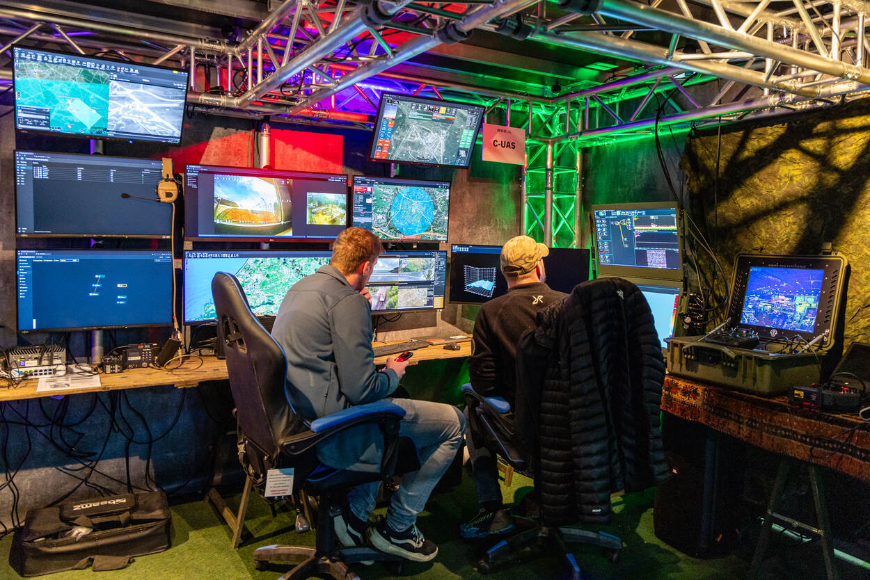 Dit is de presentatie van een Command & Control-bunker van BSS Holland. “Hun boodschap: het draait niet meer om losse drone-systemen, maar om de totale geïntegreerde aanpak”, promoot Martin.