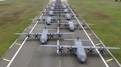 “Een-twee in de maat, anders wordt de juffrouw kwaad”, zongen we vroeger uit volle borst bij het betreden van de lagere (nu basis)school. Deze parades van vliegtuigen doet er een beetje aan denken. De zogenoemde elephant walk links wordt gevormd door C-130J Super Herculessen van de Amerikaanse luchtmacht. Ze staan op Vliegbasis Ramstein in Duitsland. De foto is van majoor Derek Brockmann.