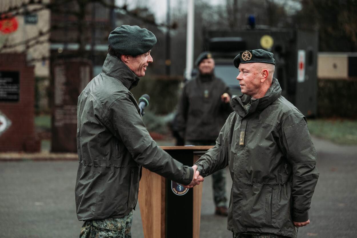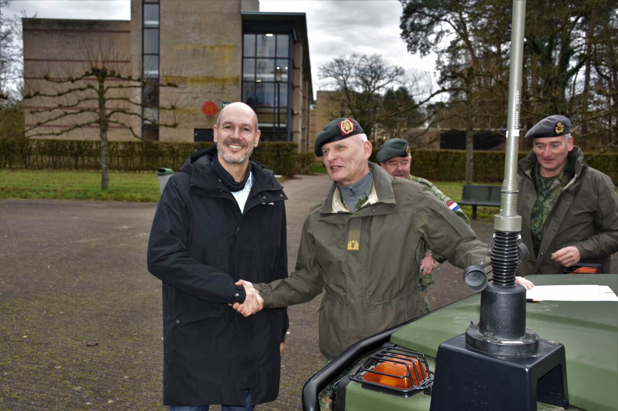 Een man in burger en een militair schudden elkaar de hand voor een militair voertuig. Daarachter staan nog 2 militairen.
