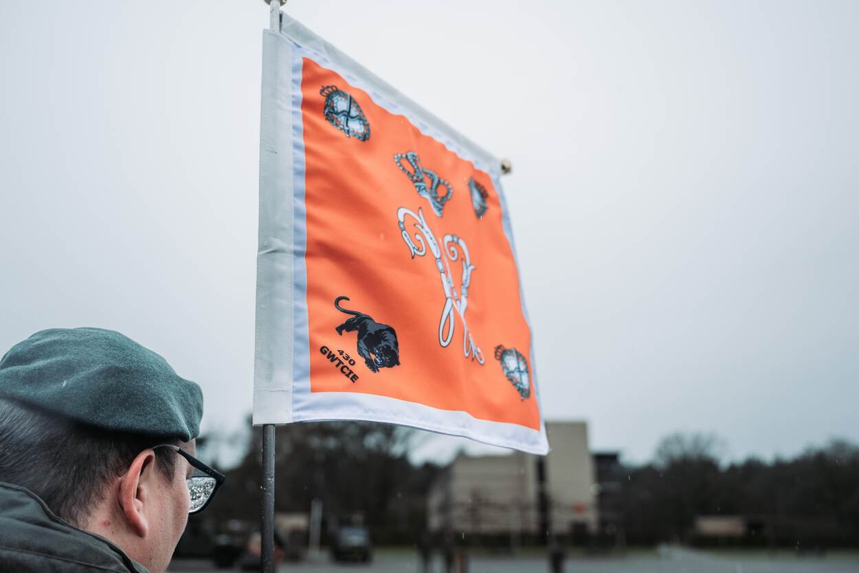 Een bebrilde militair met hoofddeksel staat achter een oranje vlag.