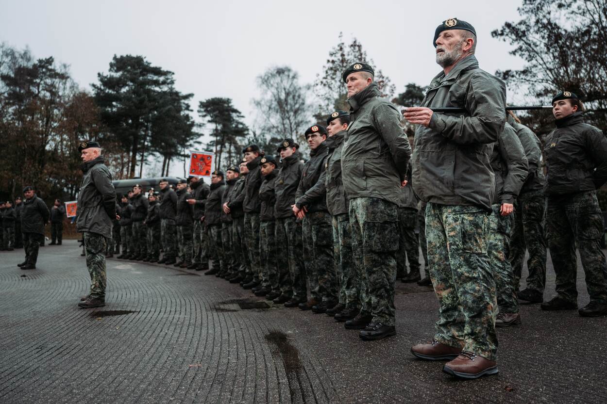 Een peloton militairen staat in rijen geformeerd met daarvoor twee andere militairen.