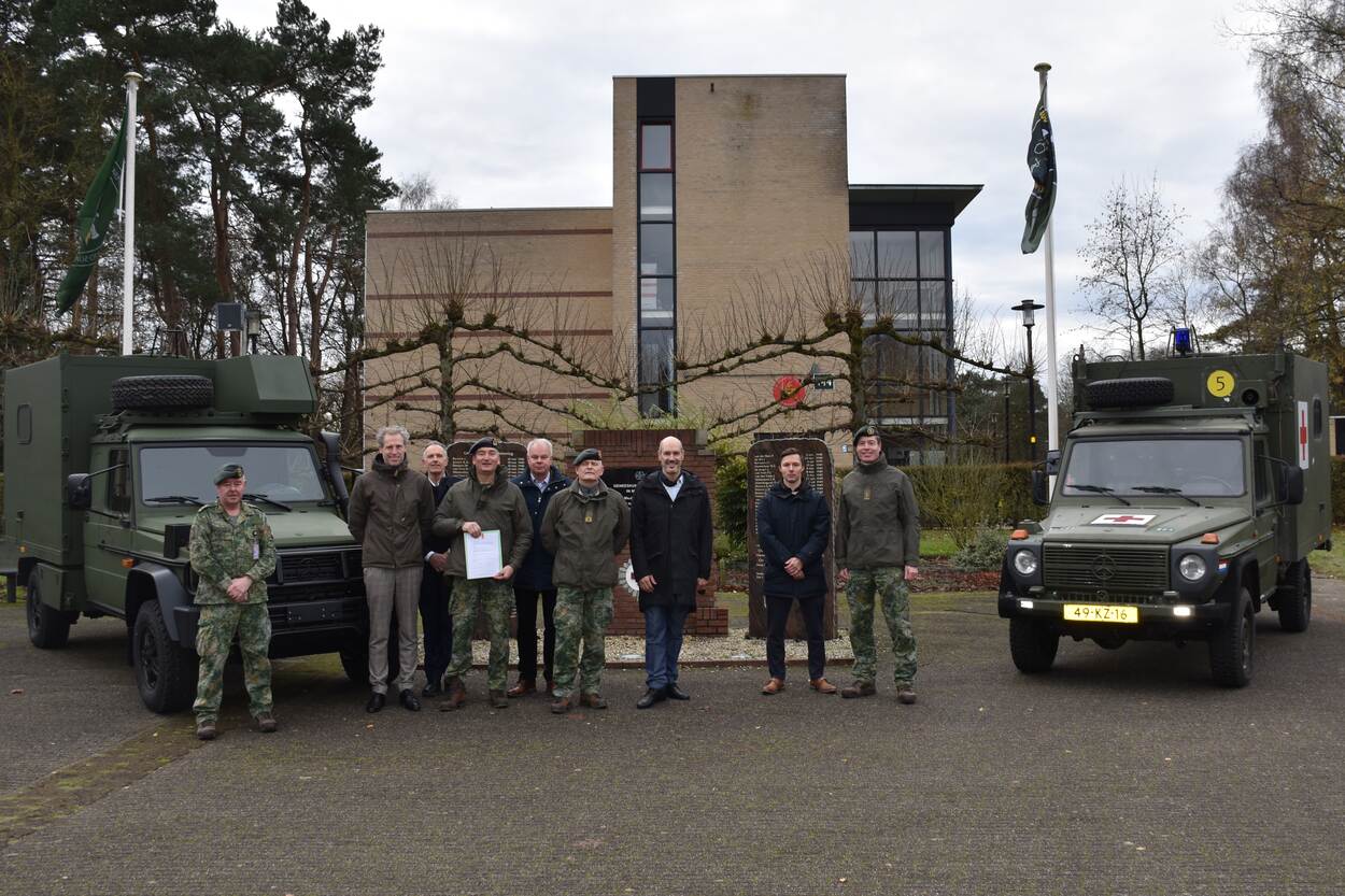 Een burger met ketting en een militair staan naast militairen met op de achtergrond een militaire ziekenauto.
