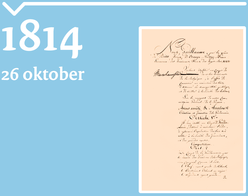 De latere Koning Willem I ondertekent het oprichtingsbesluit van de Marechaussee. De Marechaussee dient de onveiligheid op het platteland in de Belgische provincies van het Verenigd Koninkrijk te bestrijden. In respectievelijk 1815 en 1818 komen er compagnieën in Limburg en Noord-Brabant. Na de Belgische Afscheiding in 1839 blijft het Wapen alleen in deze provincies actief.