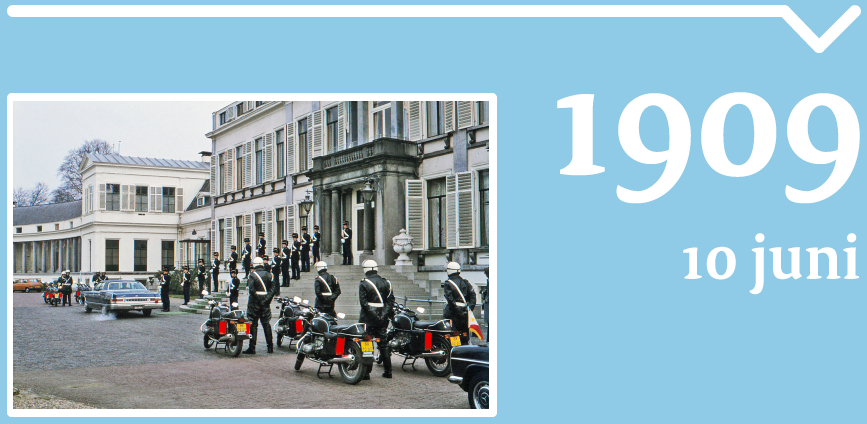 Uit onvrede over de toenmalige bewaking van paleis Het Loo verzoekt Koningin Wilhelmina aan de Koninklijke Marechaussee om deze taak op zich te nemen. Op 10 juni 1909 start een detachement van 1 wachtmeester, 2 brigadiers en 11 marechaussees met de bewaking van het paleis.