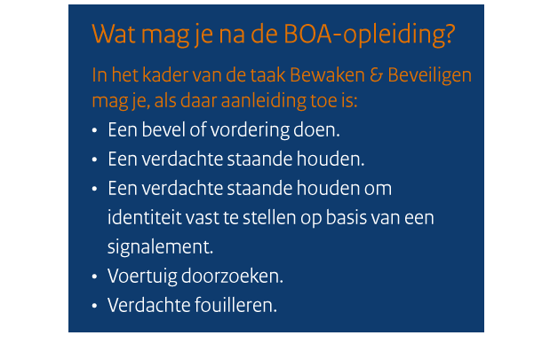"De opleiding tot BOA is goed te doen. Het is veel lesstof, dat is wel even doorbijten. Maar het is zeker een aanrader. In mei 2014 heb ik mijn opleiding afgerond, de beëdiging volgde later. Ik mag nu in principe elk feit bekeuren zolang het betrekking heeft op ons beveiligingswerk bij de paleizen.