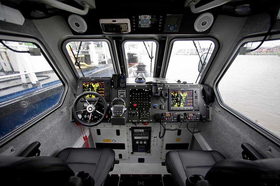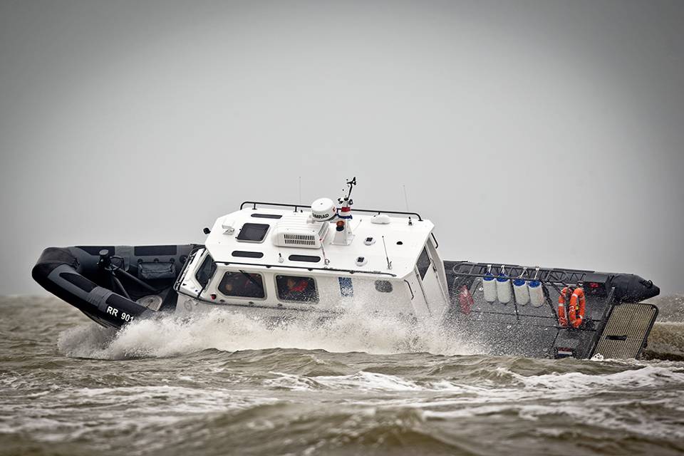 De lucht is loodgrijs als de 12 meter lange RR901 de haven van het pittoreske Harlingen achter zich laat voor een tochtje buitengaats. Zware wolken jagen door de lucht, af en toe regent het en er staat een stevig windje, waardoor golven van een halve meter ontstaan. Maar daar heb je op de nieuwe FRISC weinig last van. De reden hiervoor maakt het vaartuig uniek. Het is namelijk in samenspraak met de leverancier en de Defensie Materieel Organisatie voorzien van een stuurhut, waarin ook nog eens op beeldschermen radar en kaarten kunnen worden geprojecteerd.