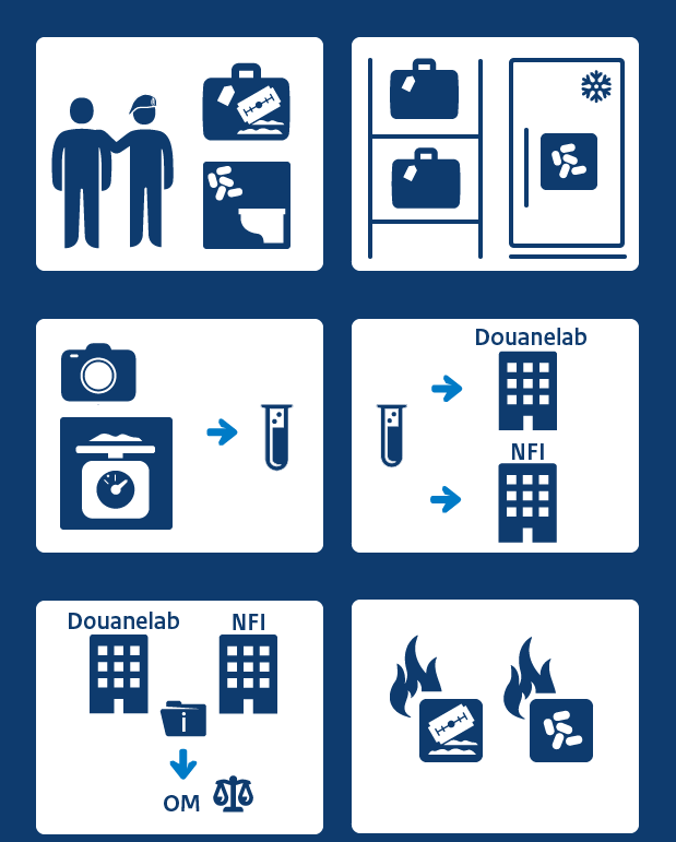 Benieuwd welke weg in beslag genomen drugs afleggen? Bekijk de plaatjes en klik op de oranje rondjes voor een uitleg.