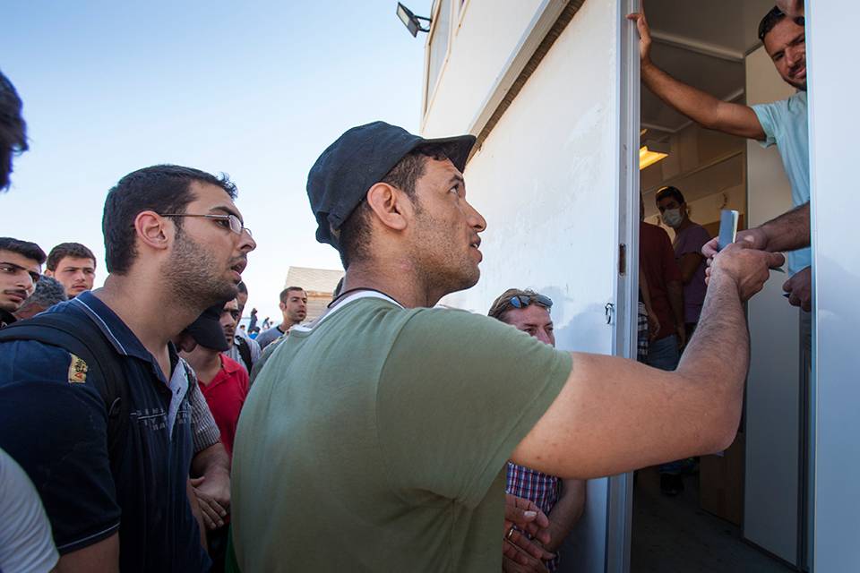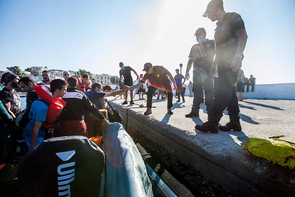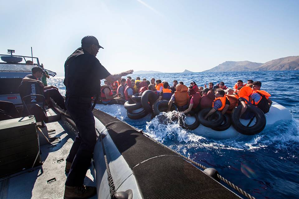Terwijl de RHIB dichterbij komt, blijkt dat het gaat om een rubberen boot met ruim 50 migranten. Mannen, vrouwen en kinderen. De opvarenden dragen feloranje zwemvesten. Het is hun enige bescherming tijdens de onberekenbare oversteek van Turkije naar Griekenland. De marechausseecollega's roepen dat ze de boot moeten volgen. De migranten zwaaien, lachen en bedanken de Nederlanders.