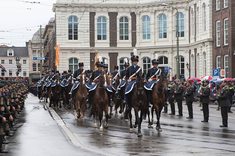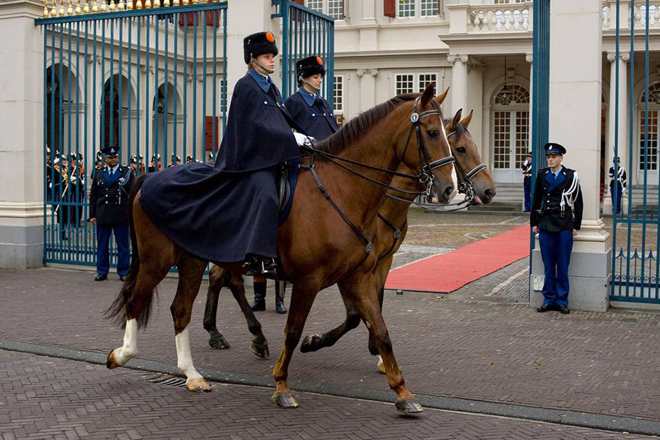Het eerste officiële optreden van een kleine groep van 13 ruiters was tijdens het huwelijk van Prins Willem-Alexander en Prinses Máxima in 2002. Ter gelegenheid van de rijtoer werd een bereden escorte te paard opgericht. Hierna is het Bereden Ere-Escorte uitgebreid tot wat het anno 2015 is: een commandant met twee vleugel-adjudanten (3), een bereden standaardwacht (6) en een pelotonscommandant met een peloton (25), samen 34 ruiters. Het complete ere-escorte van de KMar opent sinds 2002 op Prinsjesdag het bereden gedeelte van de Koninklijke stoet. Het escorte rijdt op paarden van de Belgische Federale Politie. (Foto Wim den Dunnen, collectie Nederlands Instituut voor Militaire Historie)