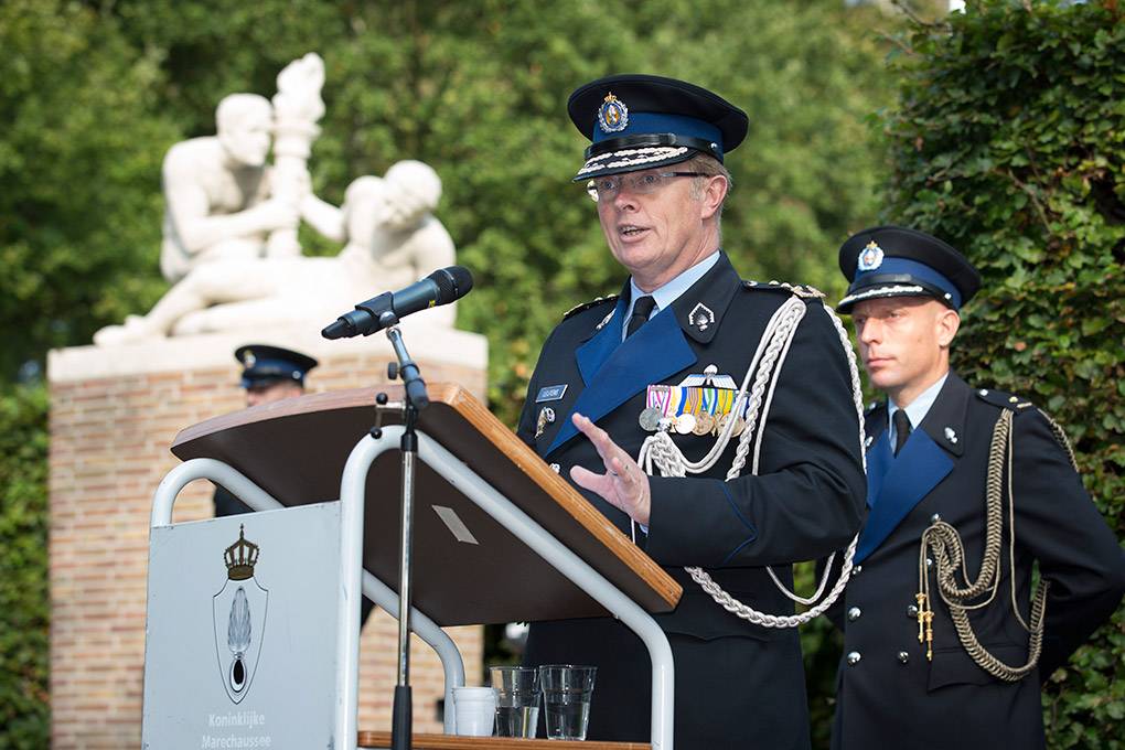 Luitenant-generaal Hans Leijtens tijdens een herdenkingsceremonie bij het Marechausseemonument in Apeldoorn.