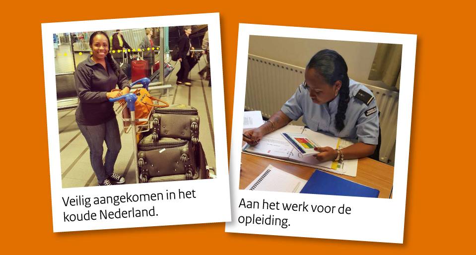 Nederland is voor mij geen onbekende bestemming. Ik ben hier al een paar keer geweest om familie te bezoeken. En 3 jaar geleden ben ik als vertegenwoordiger van het Caribisch Gebied bij de commando-overdracht van de KMar aanwezig geweest. Momenteel is ook mijn zoon overgekomen naar Nederland. Daarom reis ik 's avonds van Apeldoorn naar Utrecht om tijd met hem door te brengen. Dat is erg fijn na de lange lesdagen. Bonaire en Nederland zijn niet met elkaar te vergelijken. Wat ik mis? Natuurlijk het lekkere weer, het strand en de blauwe zee."