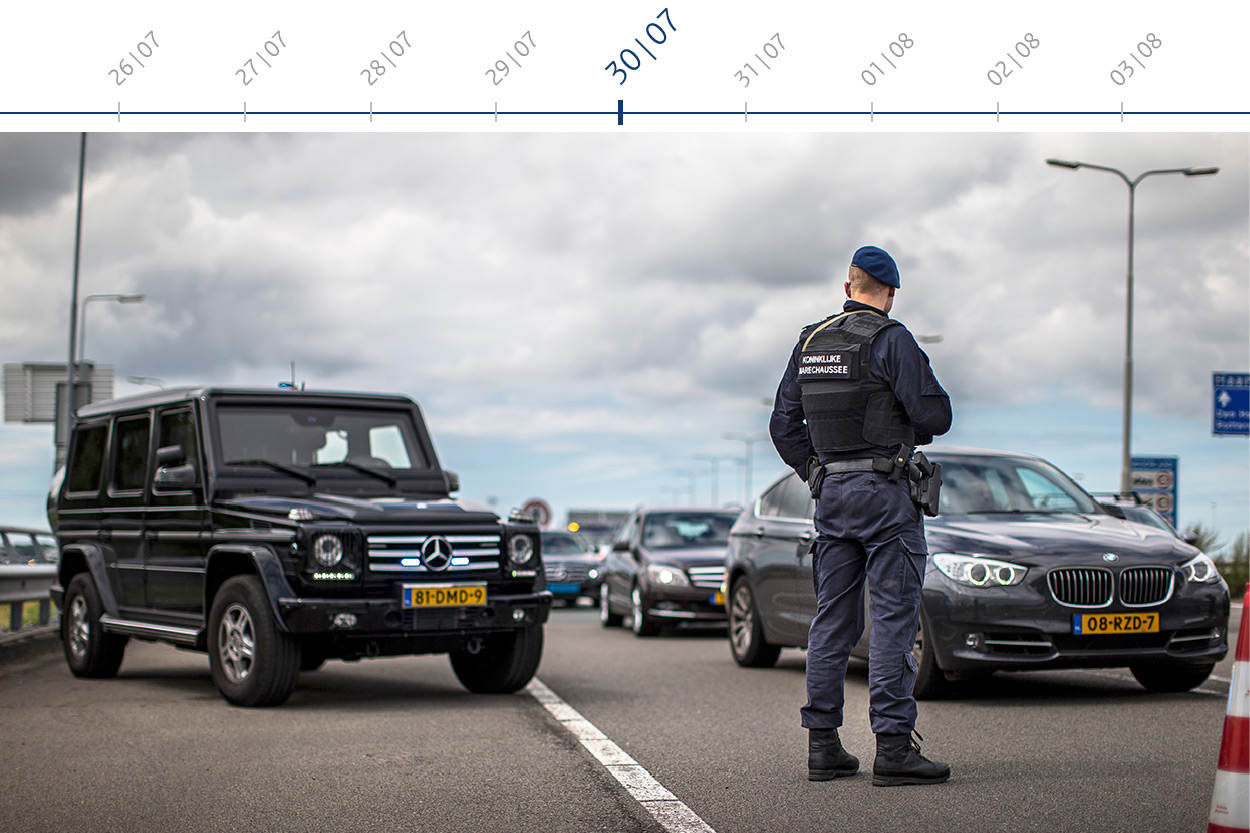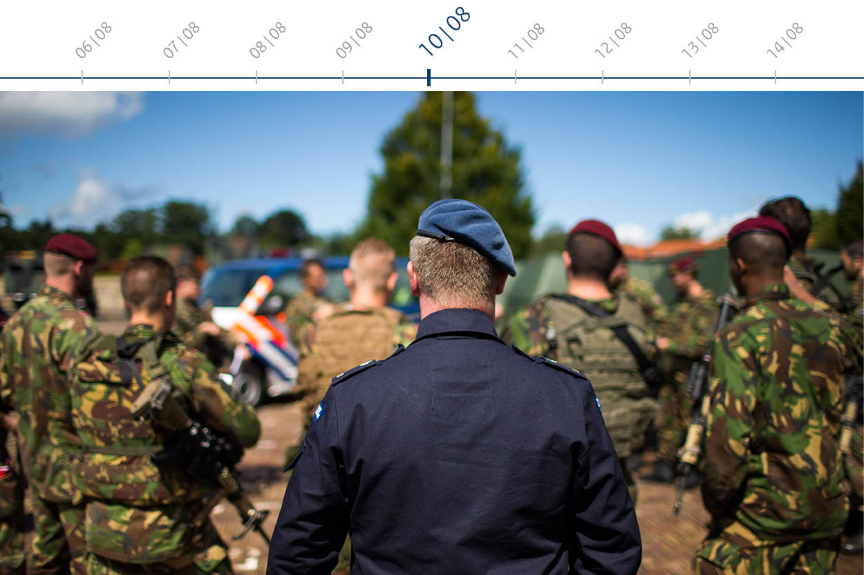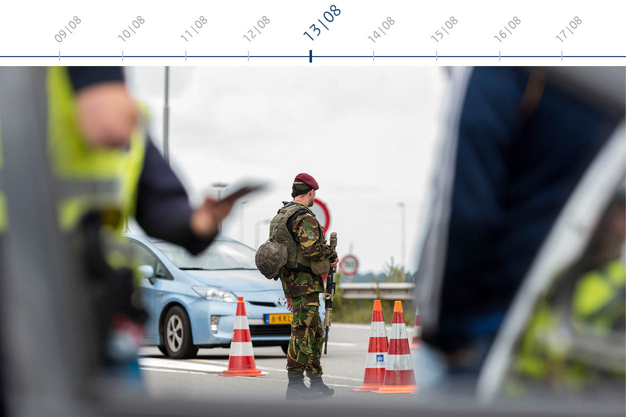 De tijdelijke ondersteuning door militairen van de Landmacht is begonnen. De militairen zijn zichtbaar bij de controles op de toegangswegen rond Schiphol. Door deze steun kunnen andere taken van de KMar, bijvoorbeeld de inzet voor Hoog Risico Beveiliging elders in Nederland en de inzet in het kader van de migratiestromen, worden opgevangen. 18 augustus worden de extra veiligheidsmaatregelen bijgesteld en voert de KMar het werk weer alleen uit.