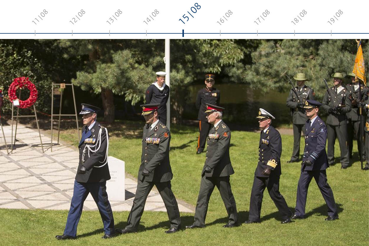 De capitulatie van Japan op 15 augustus 1945 in Zuidoost-Azië is bij het Indisch monument in Den Haag herdacht. Commandant der Strijdkrachten generaal Tom Middendorp en de operationele commandanten van de Marechaussee, Marine, Landmacht en Luchtmacht legden een krans uit naam van de Nederlandse krijgsmacht. Bij de herdenking was ook minister Jeanine Hennis-Plasschaert aanwezig.