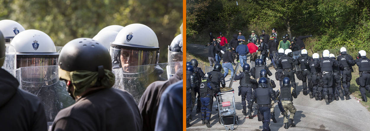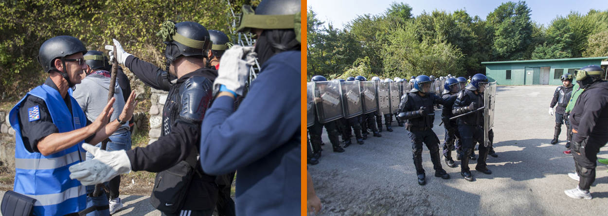 Als de Sarilandse relschoppers na een halve minuut de politieagent nog niet hebben neergezet, komt de Europese versterking in actie. Oekraïners, Spanjaarden, Kroaten en 7 collega's van de Bijstandseenheid (BE) lopen in linie de heuvel af. Het duurt niet lang voor de relschoppers het op een lopen zetten.