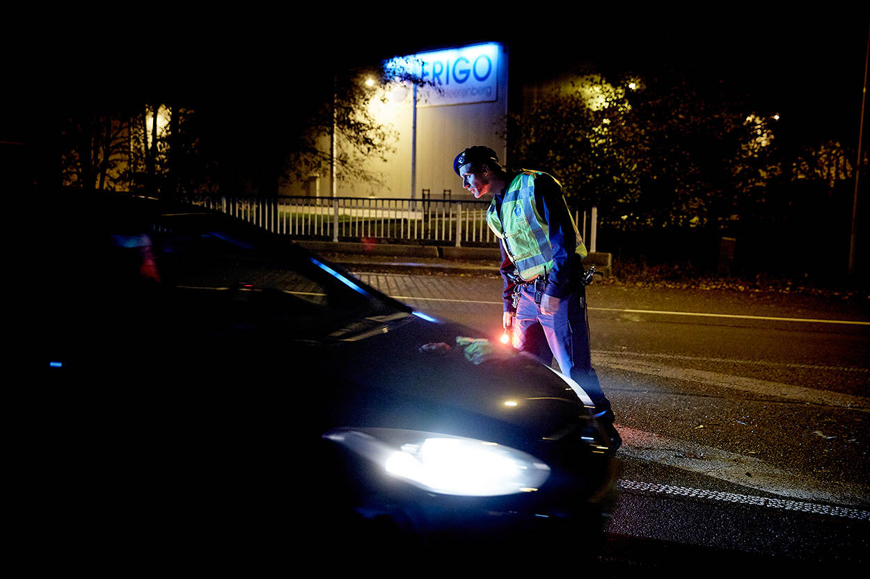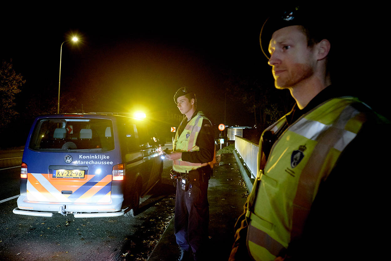 De maan probeert tevergeefs door het dikke wolkendek heen te breken en miezer verandert in dikke regendruppels. In het niets verhullende, witte led-licht van de mobiele lichtunits op de parkeerplaats langs de A12 bij de Nederlands-Duitse grens, staan tientallen bestuurders ongeduldig naast hun auto's. De Koninklijke Marechaussee is druk bezig met een omvangrijke, internationale controle met de naam Korridor Fahndung.