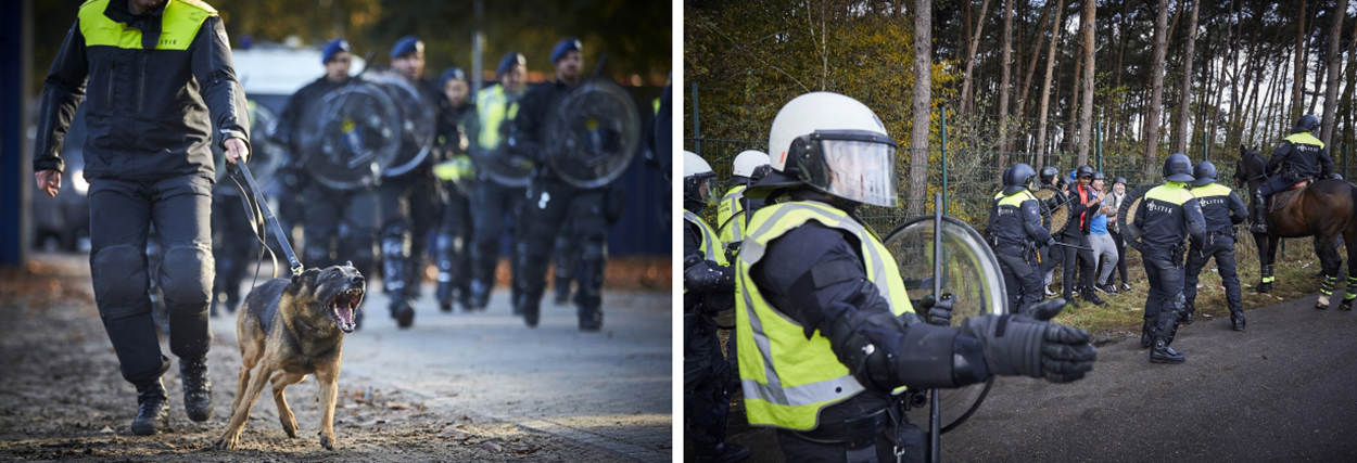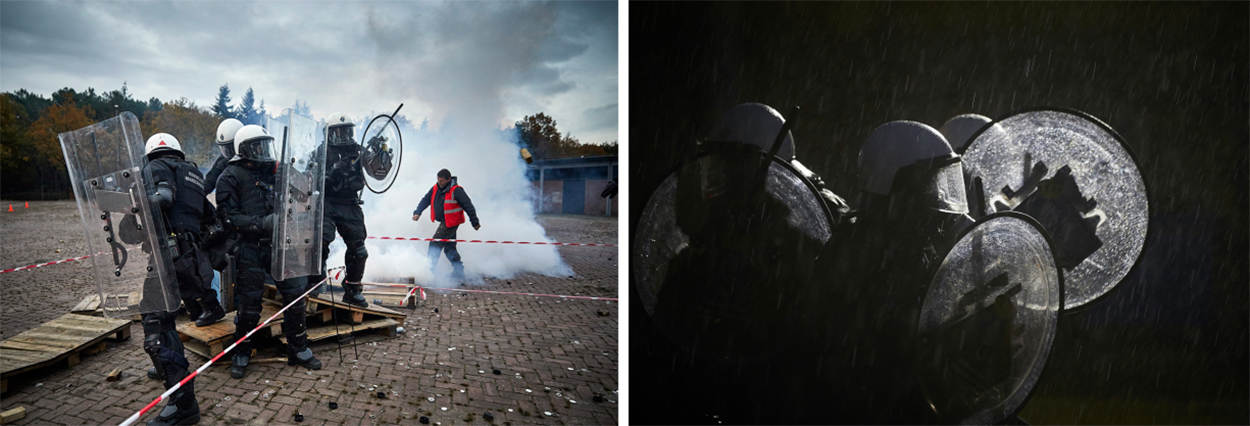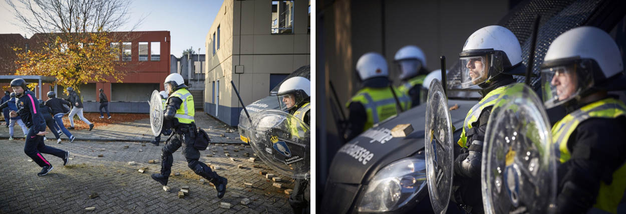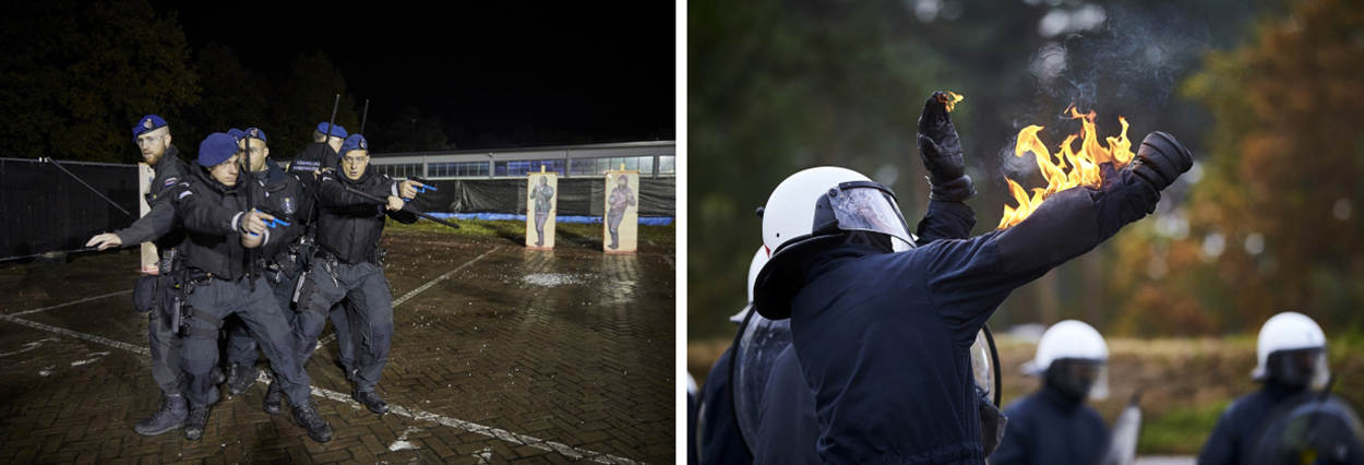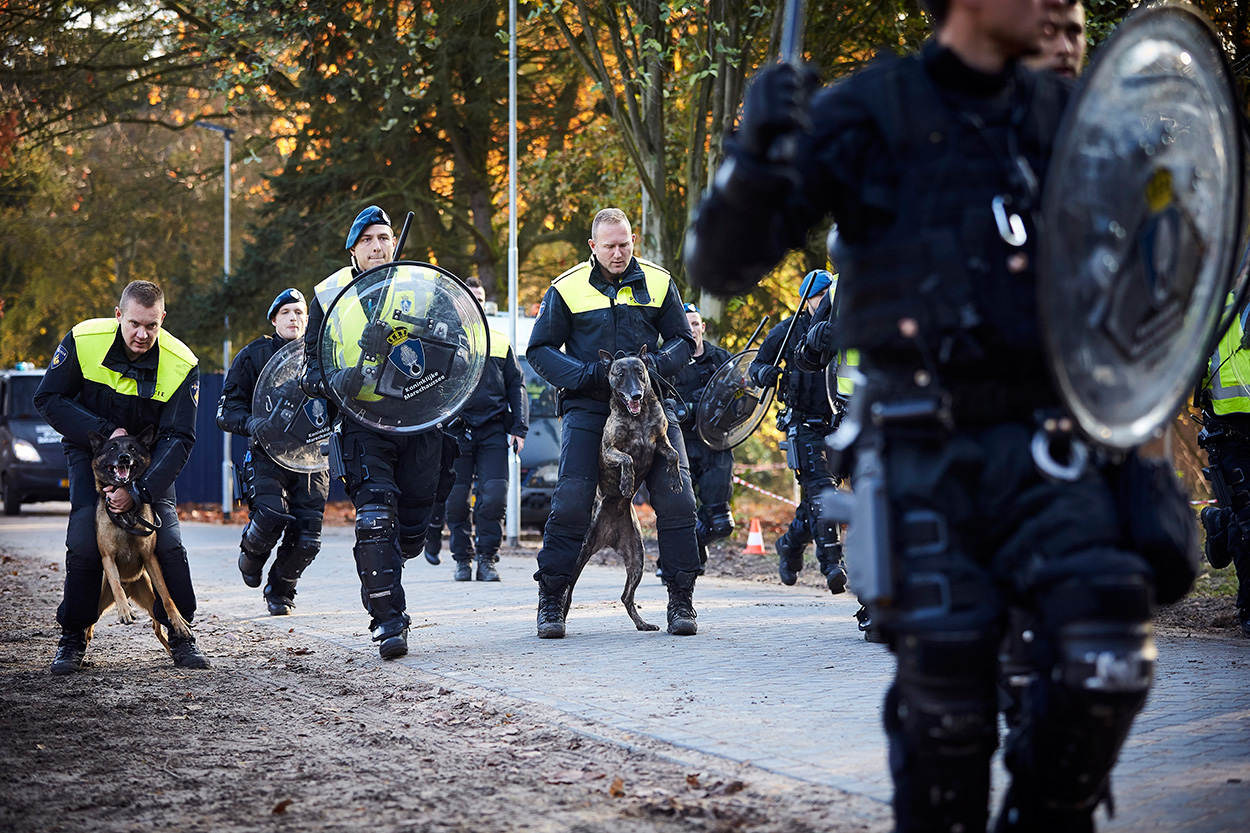"Charges, nu", op dit commando komen ME'ers met honden van achter de BE-linie naar voren om ruimte te pakken. De BE'ers wachten geduldig tot de ME'ers weer stilstaan met hun blaffende honden. "Sommige BE'ers hebben niet eerder opgetreden met honden. Ze leren bijvoorbeeld hoe de honden worden ingezet en waar ze rekening mee dienen te houden", legt Van Vliet uit.