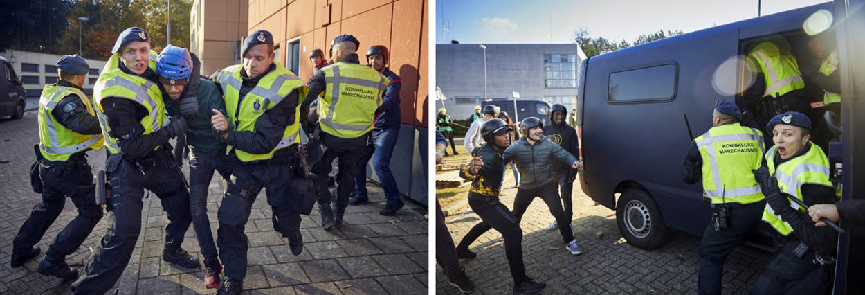 De Marechaussee en de politie beschermen samen het gemeentehuis in het oefendorp tegen raddraaiers.