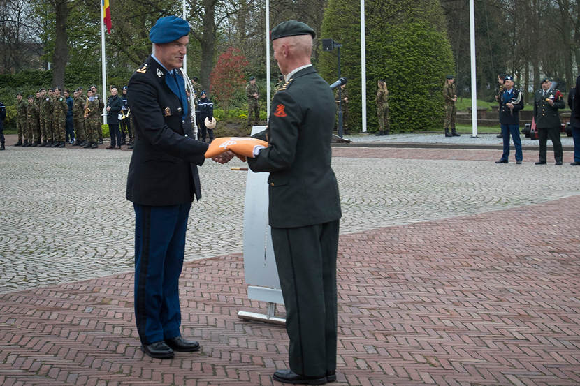 Als blijk van waardering en uiting van vertrouwen reikte commandant Koninklijke Marechaussee luitenant-generaal Harry van den Brink de vlag uit aan de commandant van de KMA, kolonel Laurens Jobse. De vlag staat symbool voor het mandateren van de opleidingsverantwoordelijkheid tot aan het eskadronsniveau. Op zijn beurt overhandigde Jobse de vlag aan de commandant van het KMar-eskadron majoor Morsink. Als eskadronscommandant is hij verantwoordelijk voor het uitvoering geven aan de officiersopleiding van de KMar-cadetten.