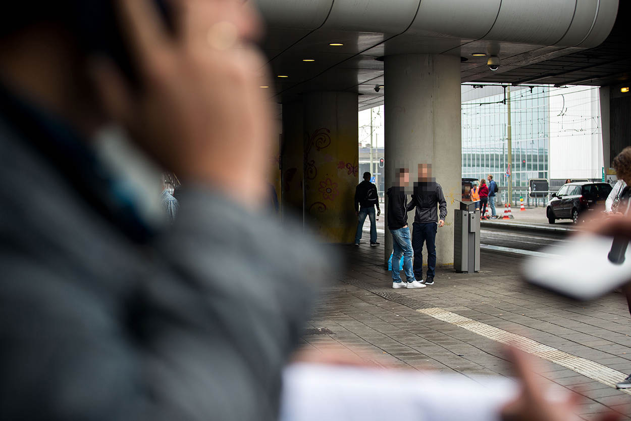 Het is woensdagmorgen, 09.00 uur. Op Den Haag Centraal is de ochtendspits in volle gang. Treinen komen tot stilstand en uit de openglijdende gele deuren stromen honderden forenzen de stationshal in. Mannen met aktetassen, vrouwen in mantelpakjes haasten zich naar de uitgang, terwijl hipsters, studenten en toeristen rustig door de hal slenteren. Plots tikt marechaussee-2 Niels zijn ranggenoot Marcel op de schouder. Zijn lippen bewegen nauwelijks als hij wat zegt, maar zijn collega luistert aandachtig en volgt zijn blik.