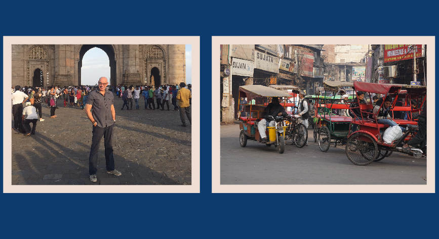 Links: De Gateway of India in Mumbai. Rechts: Alledaags straatbeeld.