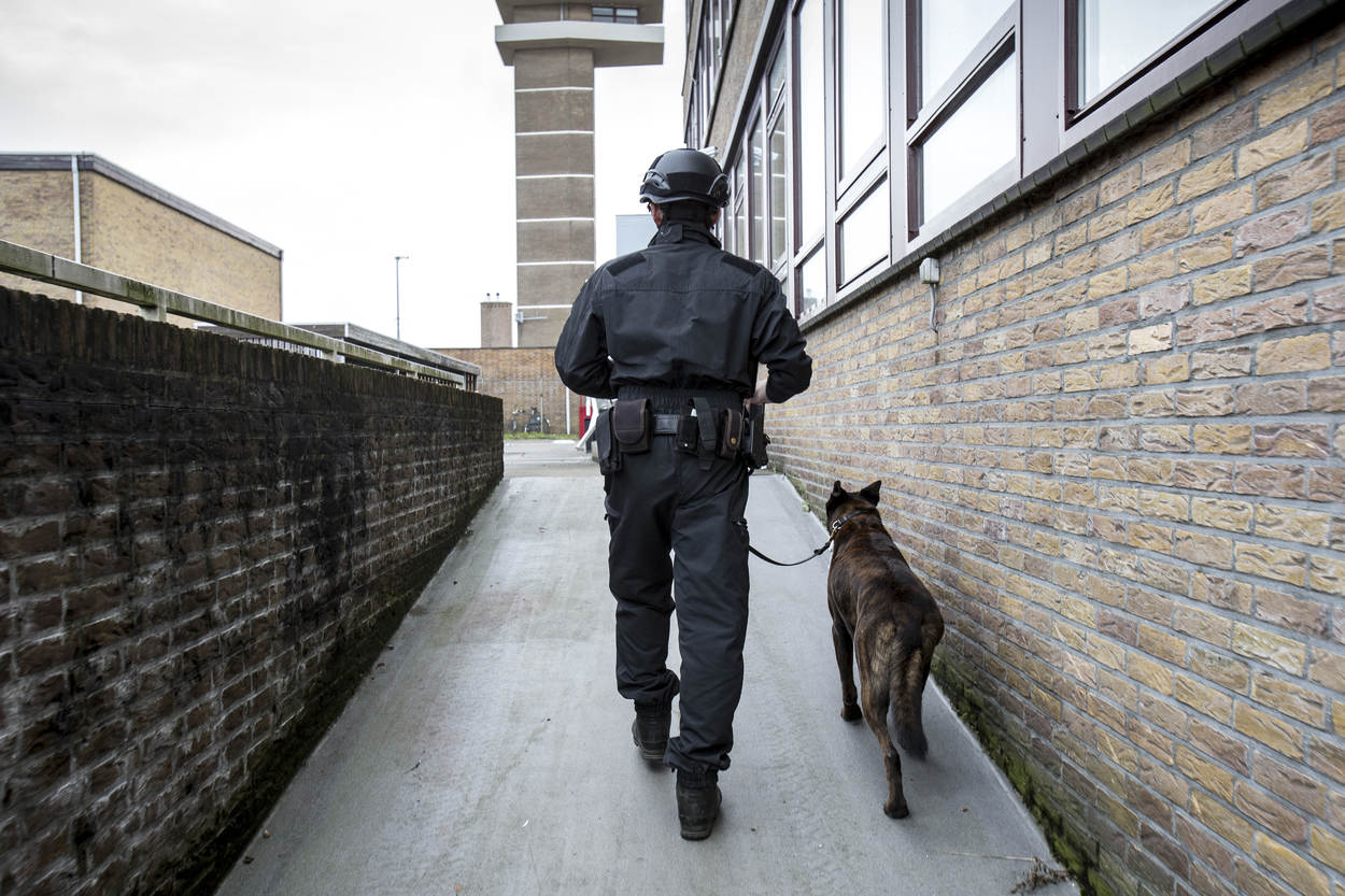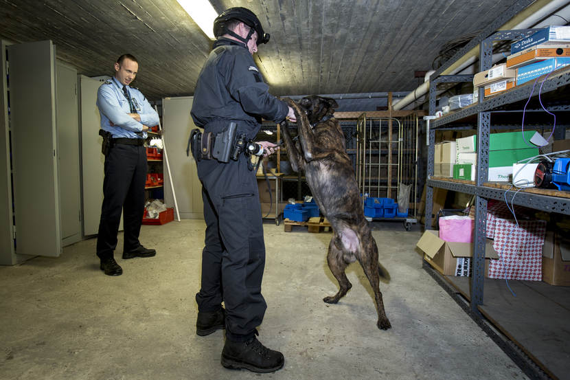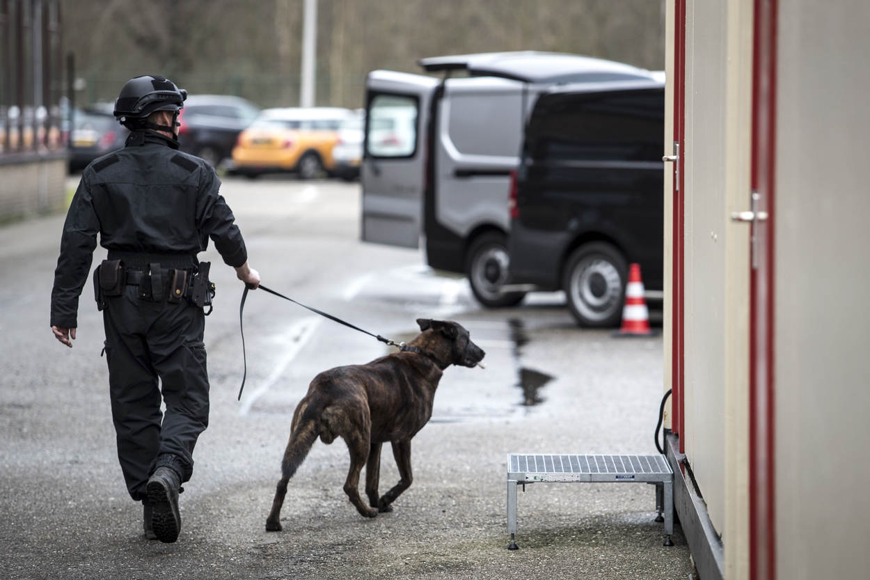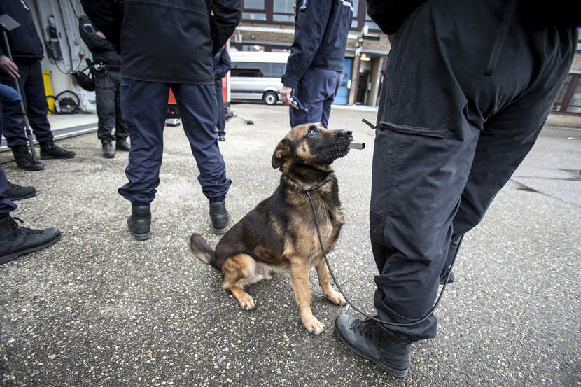 Hollandse herder Fonkel en 'baasje' Lex zijn snel ter plaatse. "De explosievenhonden zijn een hulpmiddel", benadrukken de begeleiders. "Meestal willen ze meteen aan de slag, maar soms zijn het net mensen", zegt opper Lex.