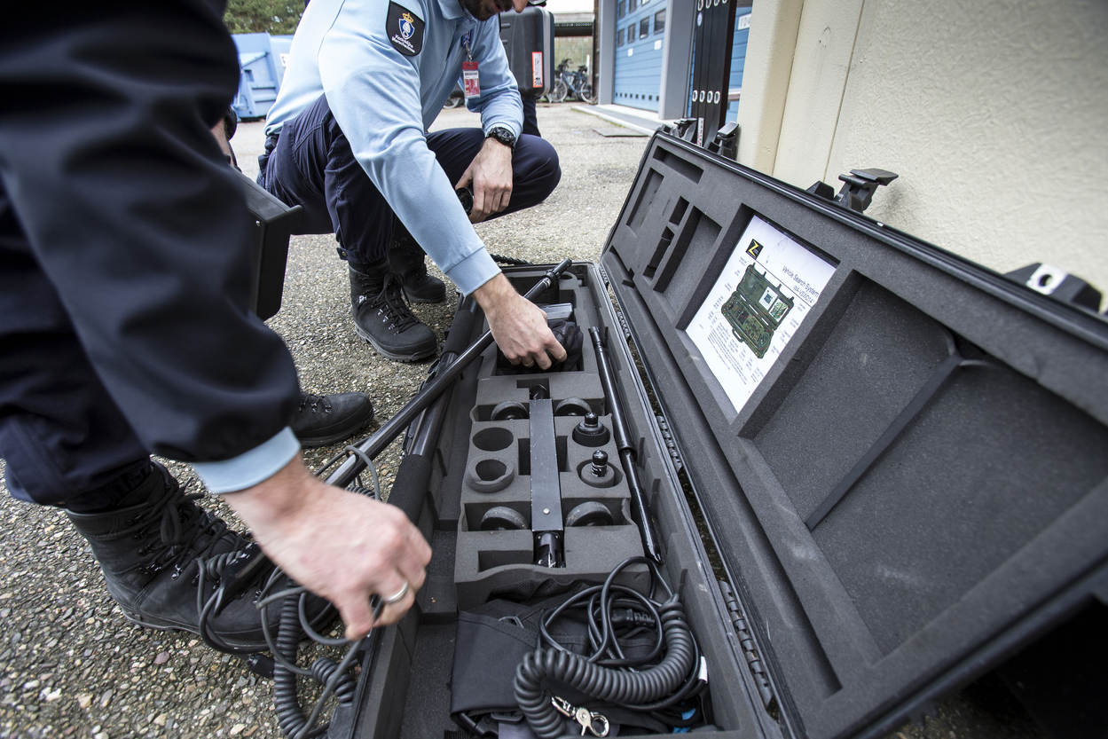 De hulpmiddelen worden uit de koffers gehaald. De explosievenverkenners van de KMar doen regelmatig preventieve zoekingen, zoals op 4 mei op de Dam. "We werken daarin veel samen met de politie, die een soortgelijke eenheid als de onze heeft", weet instructeur adjudant Edwin Branse.