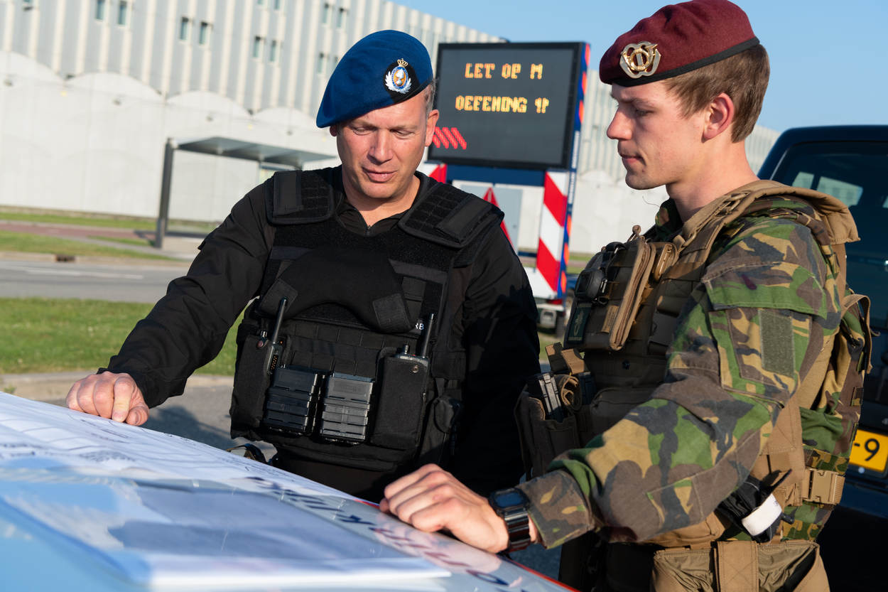 Samen worden procedures getraind, zoals het opzetten van een wegafzetting. Na enig aftasten over de taakverdeling loopt de samenwerking tussen de diverse eenheden steeds soepeler. “De interactie verloopt goed; ze raken steeds meer op elkaar ingespeeld. Burgers aanspreken en doorvragen is een vak: je moet weten wát je moet vragen. Daar komt duidelijk verbetering in”, evalueert een waarnemer van de KMar na afloop tevreden.