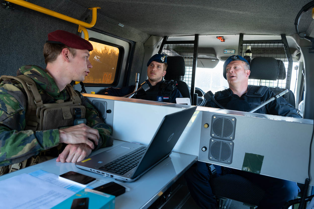 Voor de landmachters is het wennen om binnen de eigen landsgrenzen actief te zijn. “In een missiegebied zijn we zélf verantwoordelijk en zitten we in een hoger geweldsspectrum”, vertelt een van hen. “Hier is het vooral veel doorvragen. En alles is gewoon in het Nederlands.”