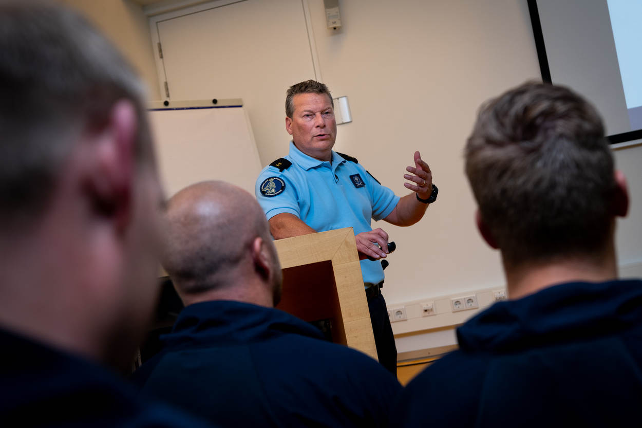 De landmachtmilitairen krijgen voorlichting over hun bevoegdheden op Nederlands grondgebied. Ze hebben al 2 dagen instructie achter de rug op het OTCKMar.