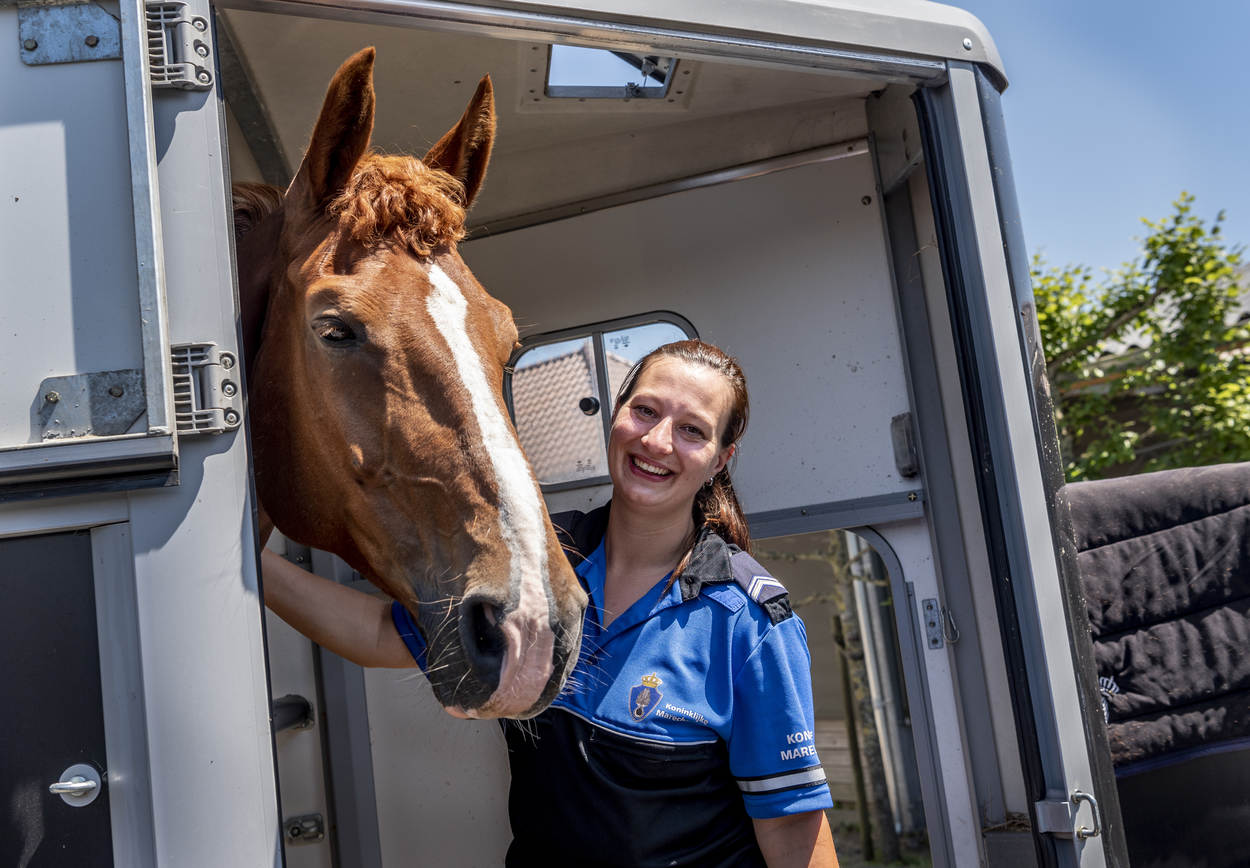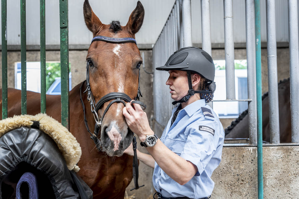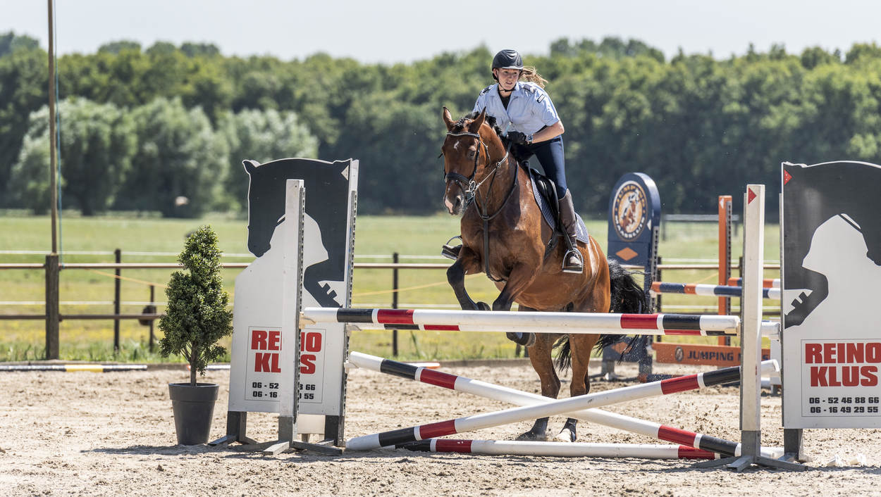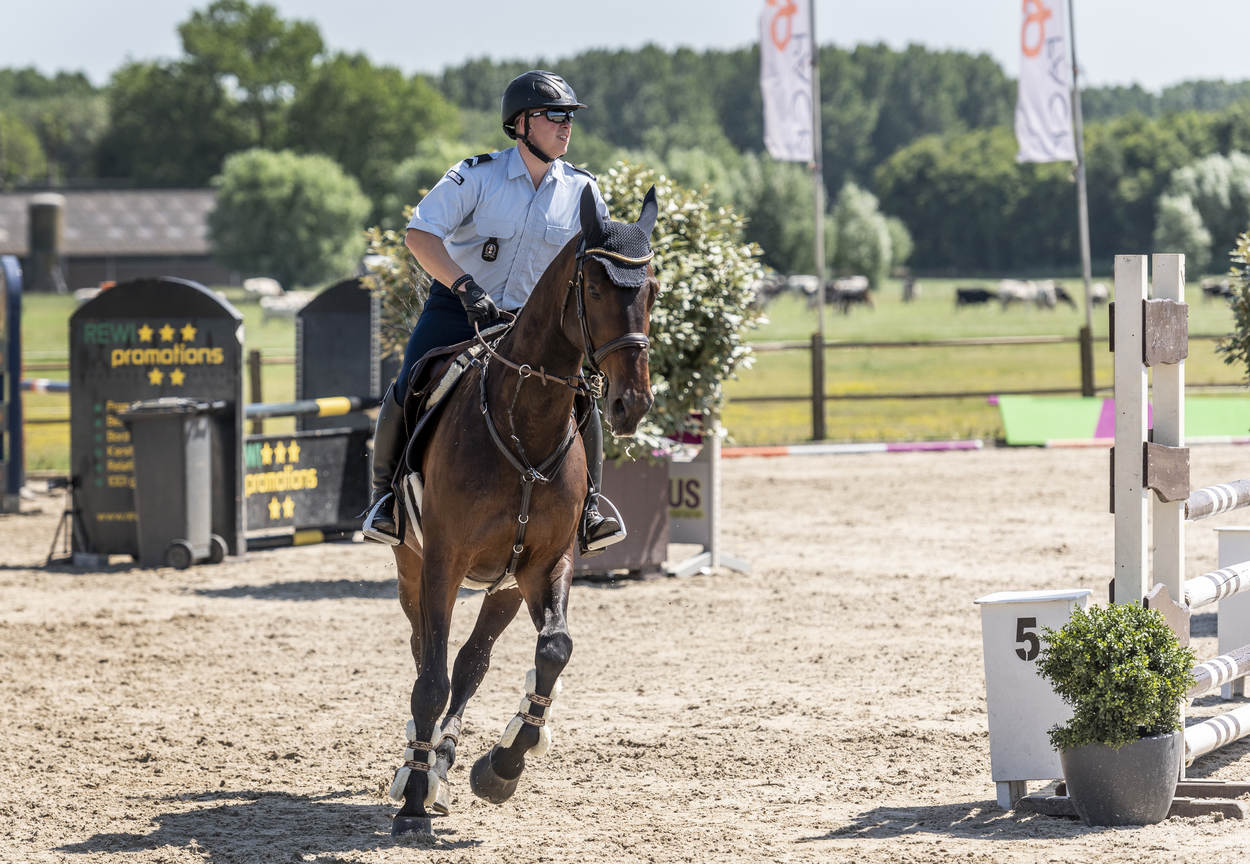 Ze trappelen van ongeduld, de ruiters die bij manege Middenhof in Maassluis de ring betreden voor de Outdoorwedstrijd Springen & Dressuur van de Marechaussee. Voor de marechaussees van het Ere-escorte van de Bereden Brigade is dit een ideale mogelijkheid om te laten zien wat ze waard zijn en om onder druk te trainen. Normaliter komen ze in het geweer bij ceremoniële gebeurtenissen als Prinsjesdag. Maar ook wanneer een nieuwe ambassadeur in ons land, gezeten in een koets, zijn geloofsbrieven aan de koning gaat aanbieden.