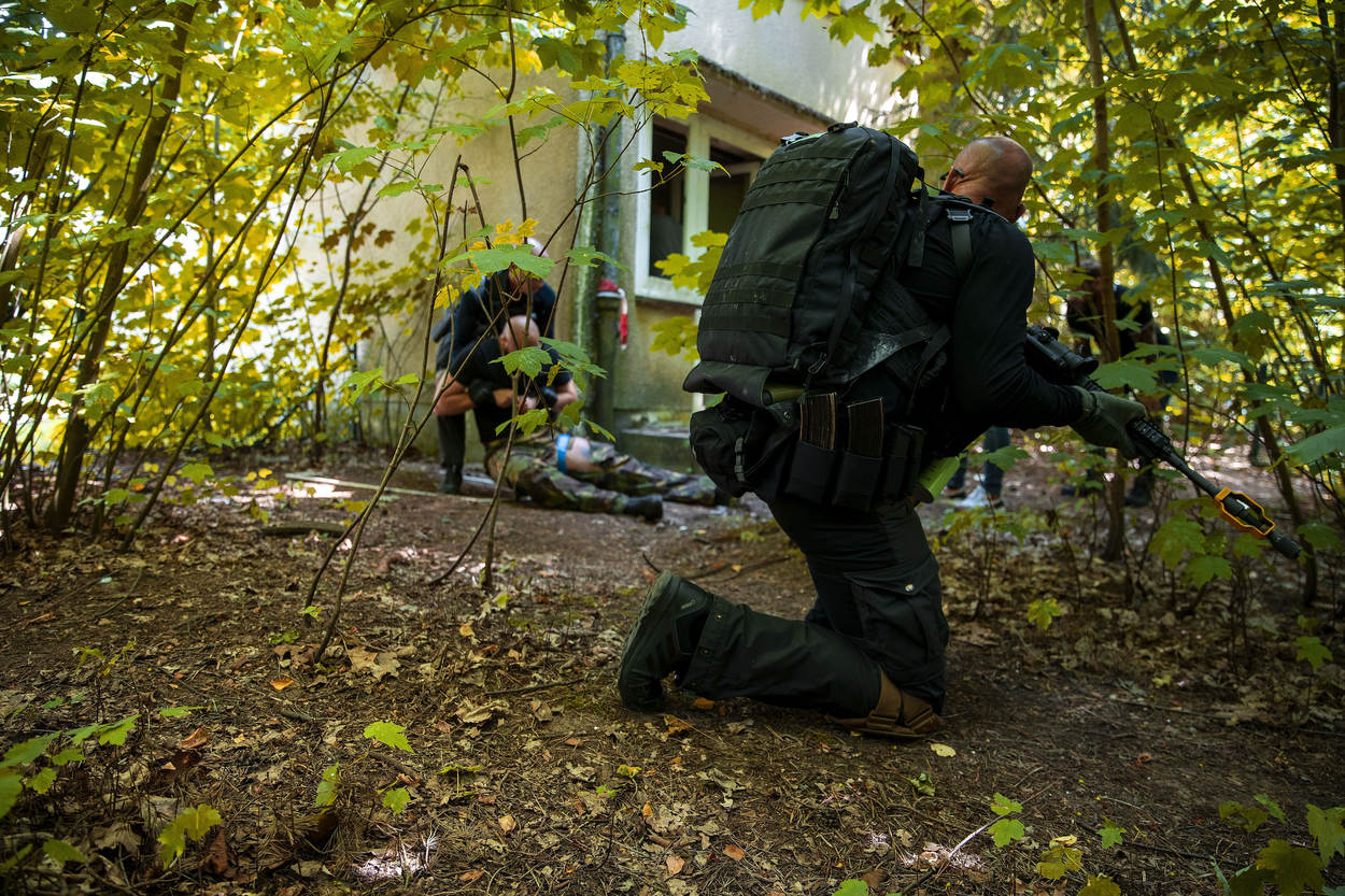 Omdat in high risk gebieden vaak wordt geopereerd in minieme teams, soms van maximaal 2 man, is teambuilding zo’n beetje het codewoord van de MBO-opleiding. Stan wijst naar ‘zijn’ jongens, die zich een eind verderop vol overgave in de volgende casus storten. “Kijk even: de oudste is 38, de jongste rond de 23. De langste 2 meter, de kleinste 1.65. Ze komen vanuit de KMar, het Korps Mariniers, het Korps Commandotroepen, de Luchtmobiele Brigade en zelfs de politie. Aan mij als klassenbegeleider de taak om in korte tijd van al die verschillende eilandjes een hechte groep te maken. Dat is best een uitdaging, maar zo’n mooi proces.”