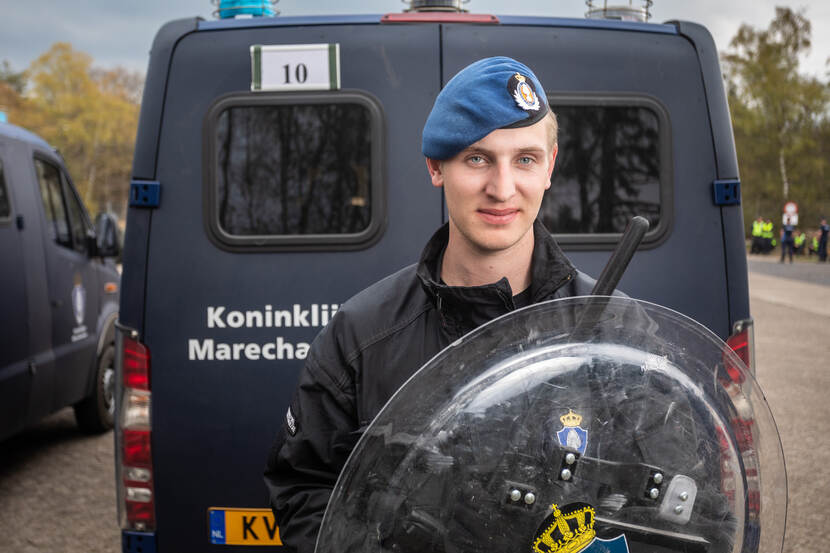 “De BE is de leukste neventaak die er is bij de KMar. Vooral het groepsoptreden spreekt mij aan. Je bent niets zonder elkaar. Bij de grensbewaking werk ik meer individueel. Tijdens de initiële opleiding stond de groep ook centraal, maar daarna heb ik dit in het werk een beetje gemist. Ik zit nu in week 2 van de BE-opleiding en heb meteen dat hechte groepsgevoel weer terug. Samen met de politie optreden, wat we nu oefenen, vind ik top. Het is gewoon supervet om gebruik te maken van hun kennis en expertise. Het geeft een geweldig gevoel om in linie te staan en 6 politiepaarden daveren langs je heen. Heel de menigte zie je opeens wegstuiven. Mooi toch?”