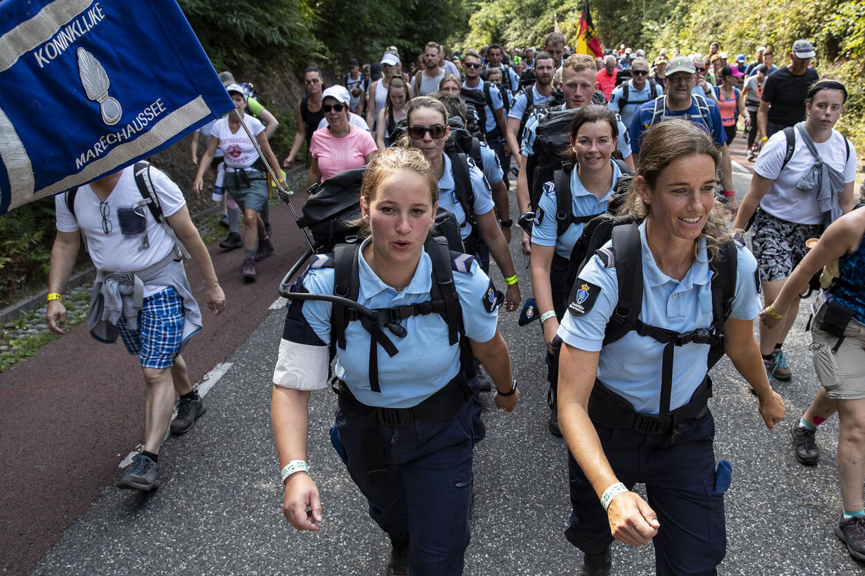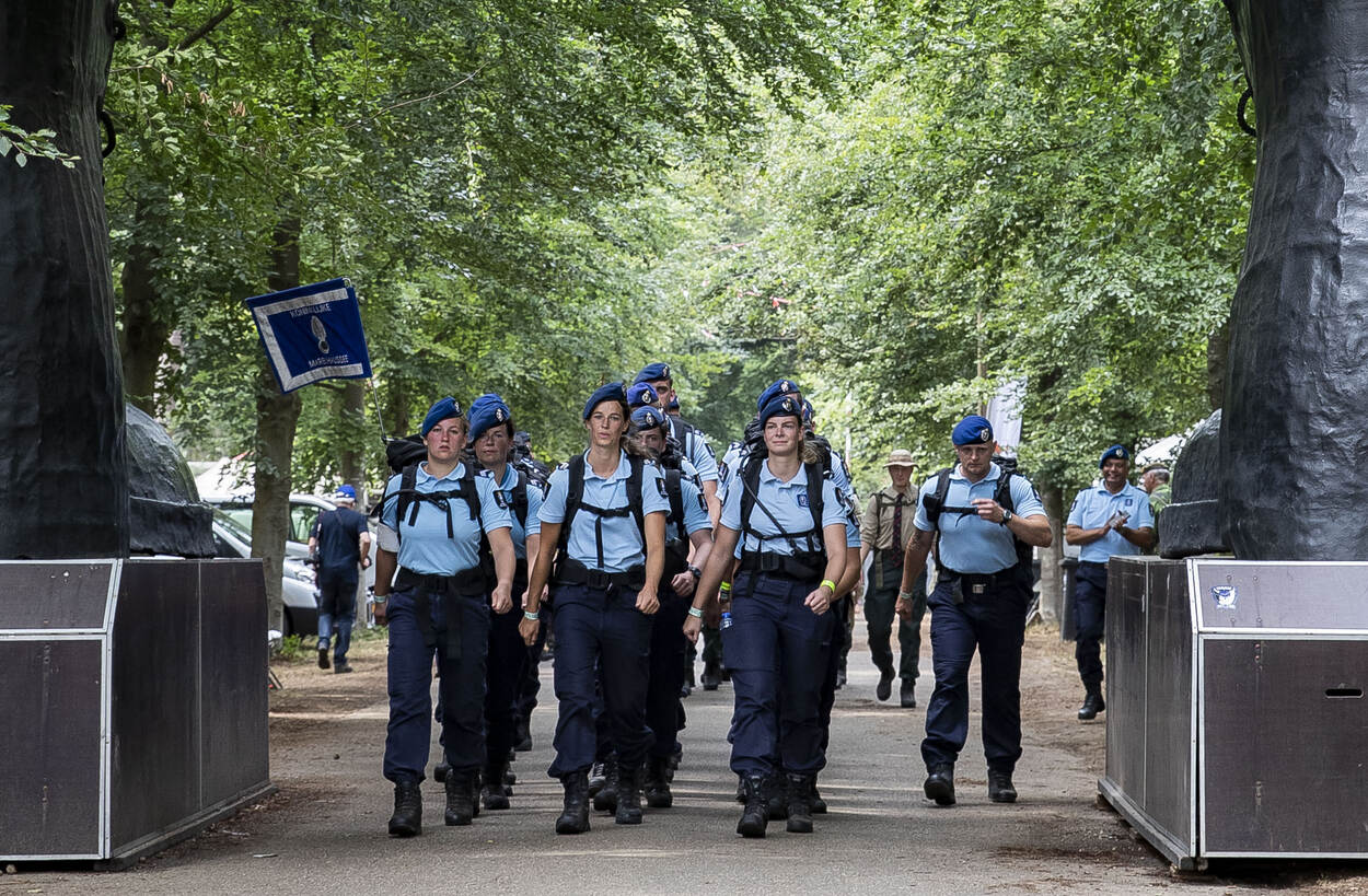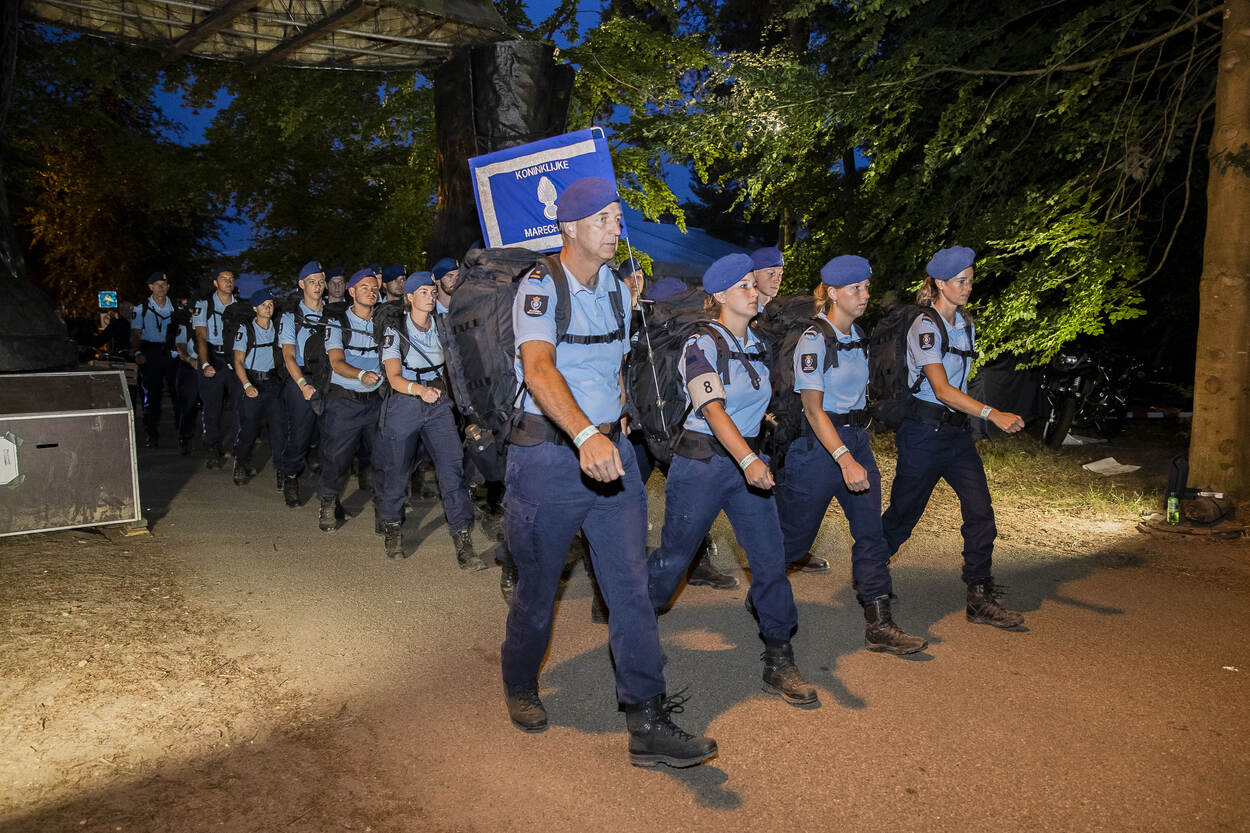 De lopers zijn niet de enigen die zich inzetten. De KMar is op de Vierdaagse ook ruimschoots aanwezig ter ondersteuning van de politie. Met bijvoorbeeld verkeersregelaars op de route, maar de KMar neemt ook de politietaak op kamp Heumensoord voor haar rekening.