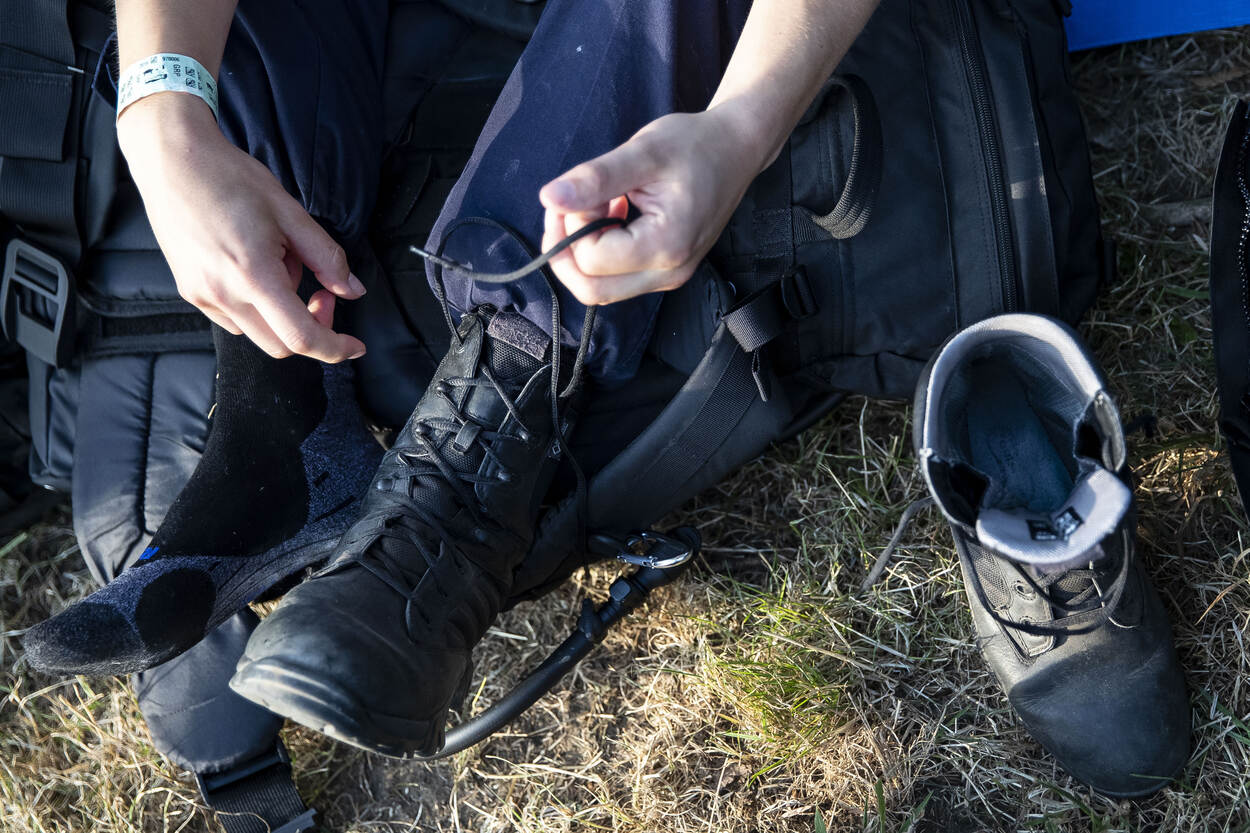 De voeten van de 25-jarige Quinn worden zorgvuldig met wol bedekt en ingetapet op Heumensoord. Het is 4.00 uur. De marechaussee der 1e klasse werkt op de afdeling Bewaken en Beveiligen bij de brigade Veluwe. Hoe zijn eerste keer Vierdaagse bevalt? Best pittig…“Mijn voeten zijn helemaal opgezwollen. Alsof ze elk moment uit mijn kisten kunnen barsten. Ik heb dit denk ik iets onderschat, misschien heb ik ook iets te weinig getraind.”