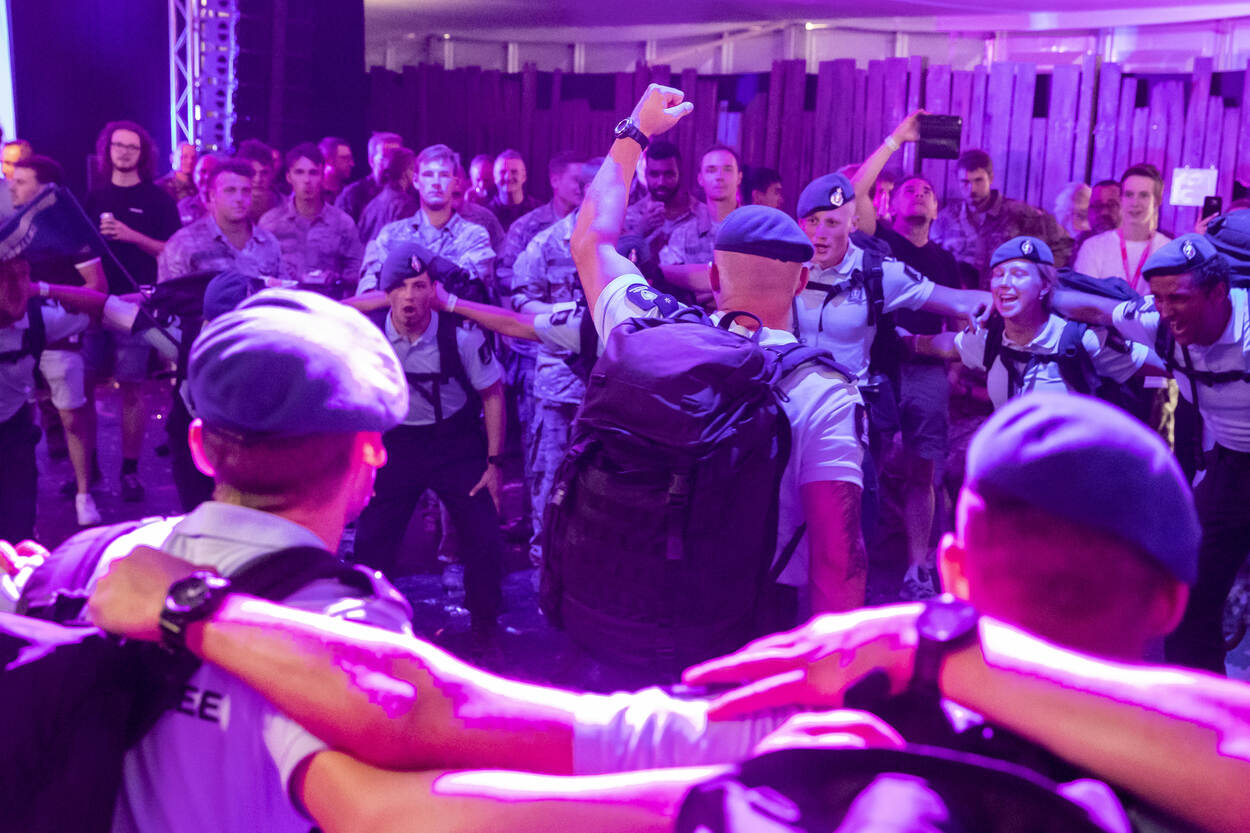 Pijnlijke voeten? Geen excuus! Wie terug is op Heumensoord geeft na aankomst nog een showtje weg in de biertent. En dat doet het detachement van de KMar met volle overgave. Een groot internationaal onthaal met applaus is het gevolg. Dag 3 zit er op, tijd om het te vieren. Het felbegeerde vaantje, de gladiolen en het Vierdaagsekruisje zijn binnen handbereik.