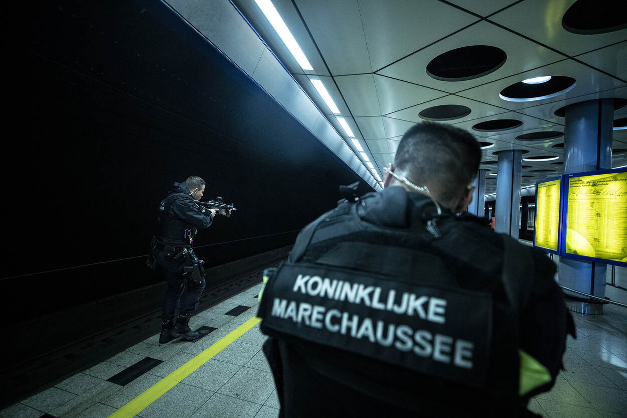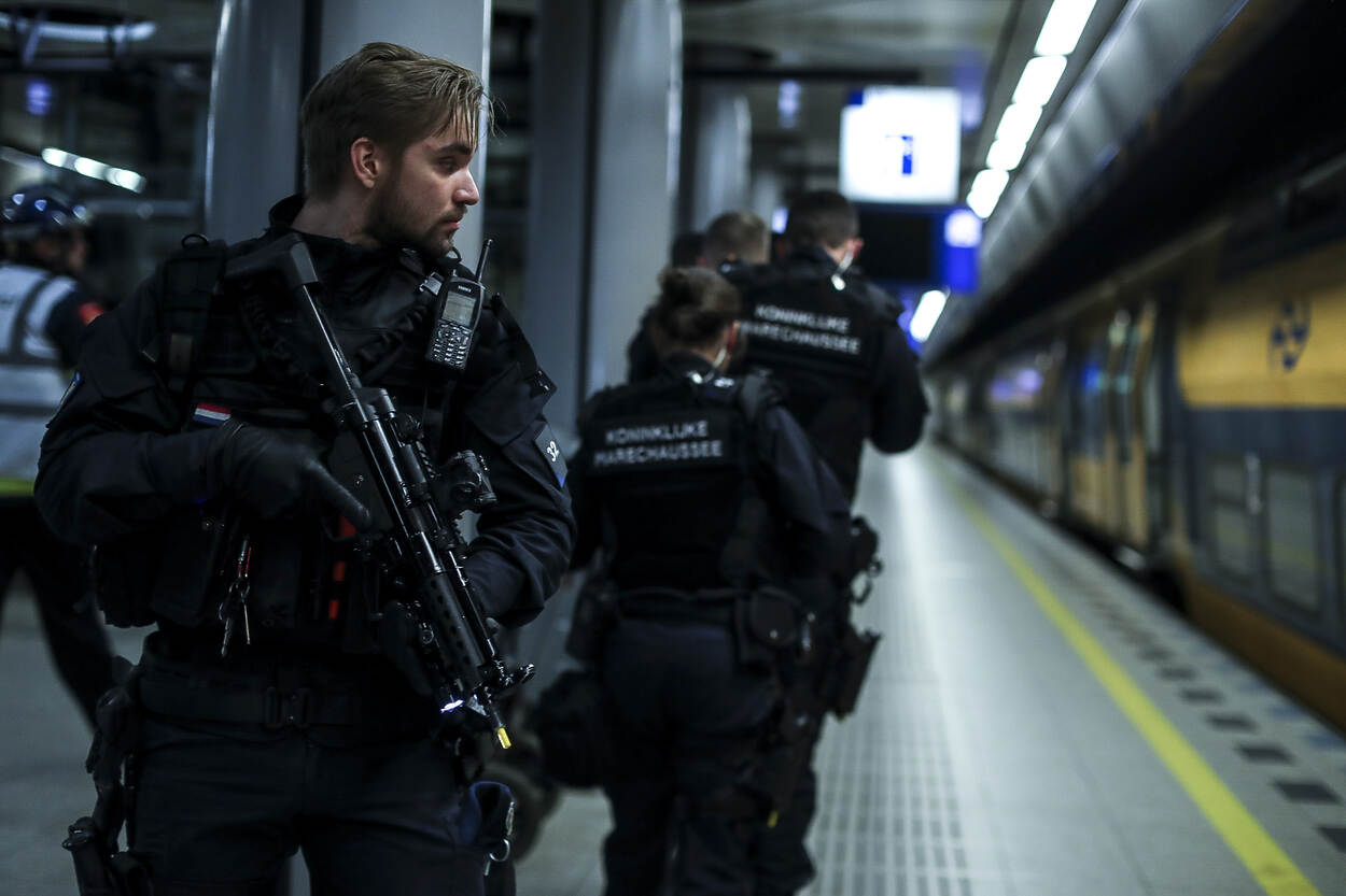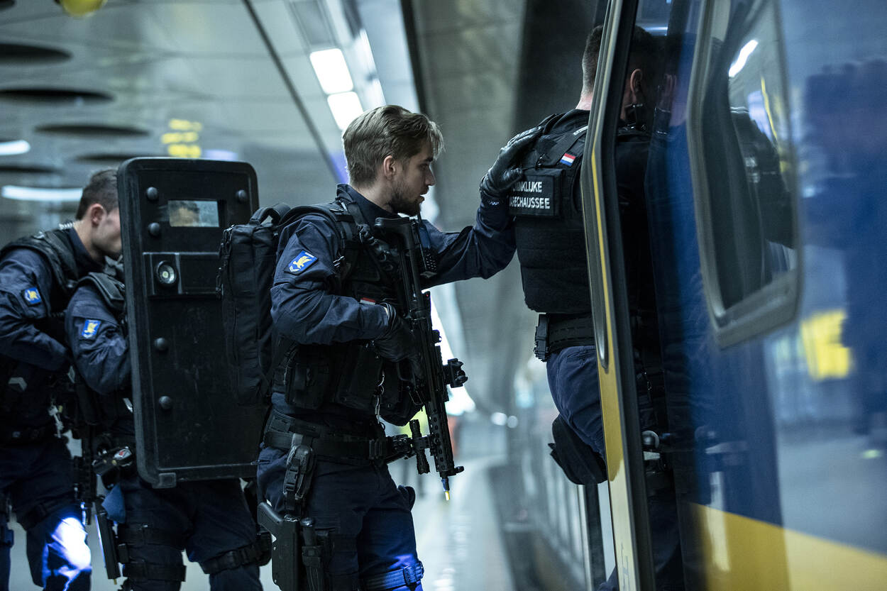 Op station Leiden is een ‘verdachte groep mannen’ de trein richting Schiphol ingegaan. Een conducteur spreekt een van hen aan, waarop die persoon zich opsluit in een toilet. Onmiddellijk wordt assistentie van de Koninklijke Marechaussee ingeroepen, die de politietaak op Schiphol vervult.