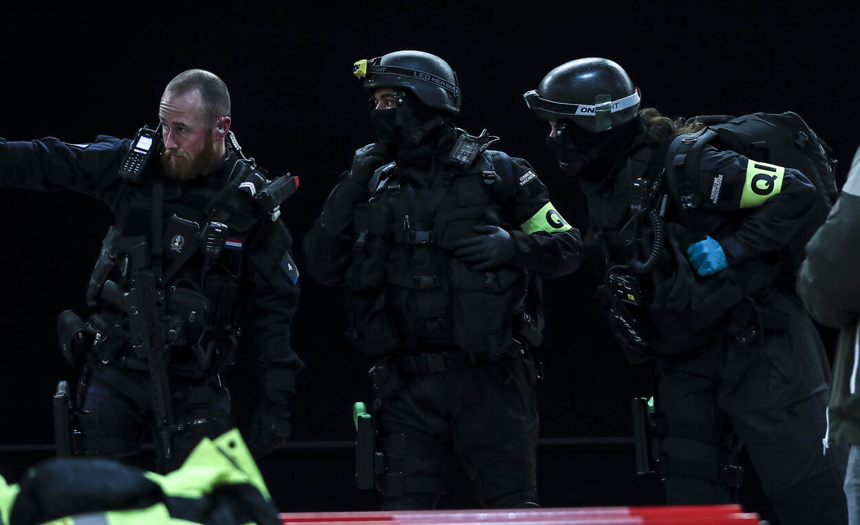 Omgeving veilig? De Officieren van Dienst beslissen dat de ‘hot zone’ een ‘warm zone’ wordt. Ambulancebroeders en brandweer snellen naar beneden en overleggen hun acties met de aanwezige marechaussees.