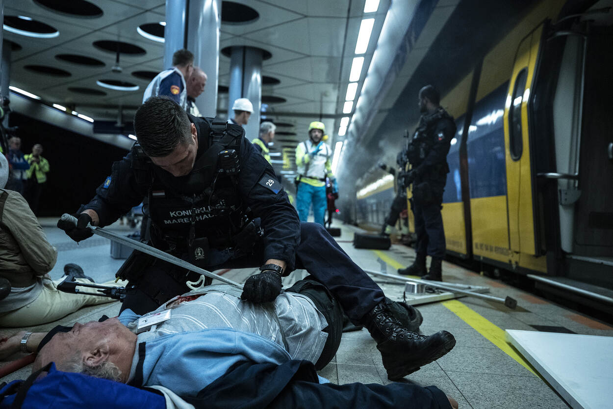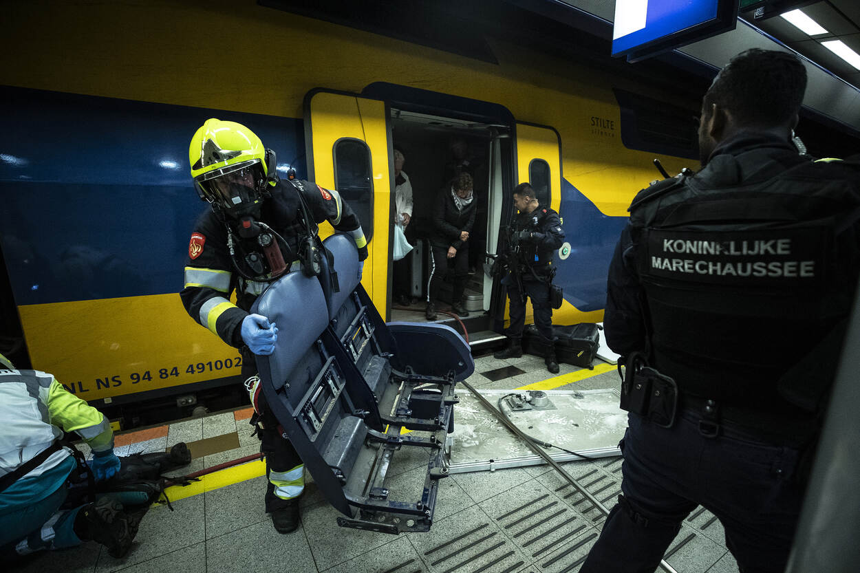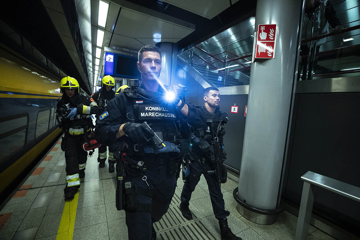 De eerste slachtoffers worden door marechaussees en personeel van de NS naar buiten geleid. Samenwerking van verschillende organisaties zowel op uitvoerend niveau als in de leiding is het doel van deze oefening.