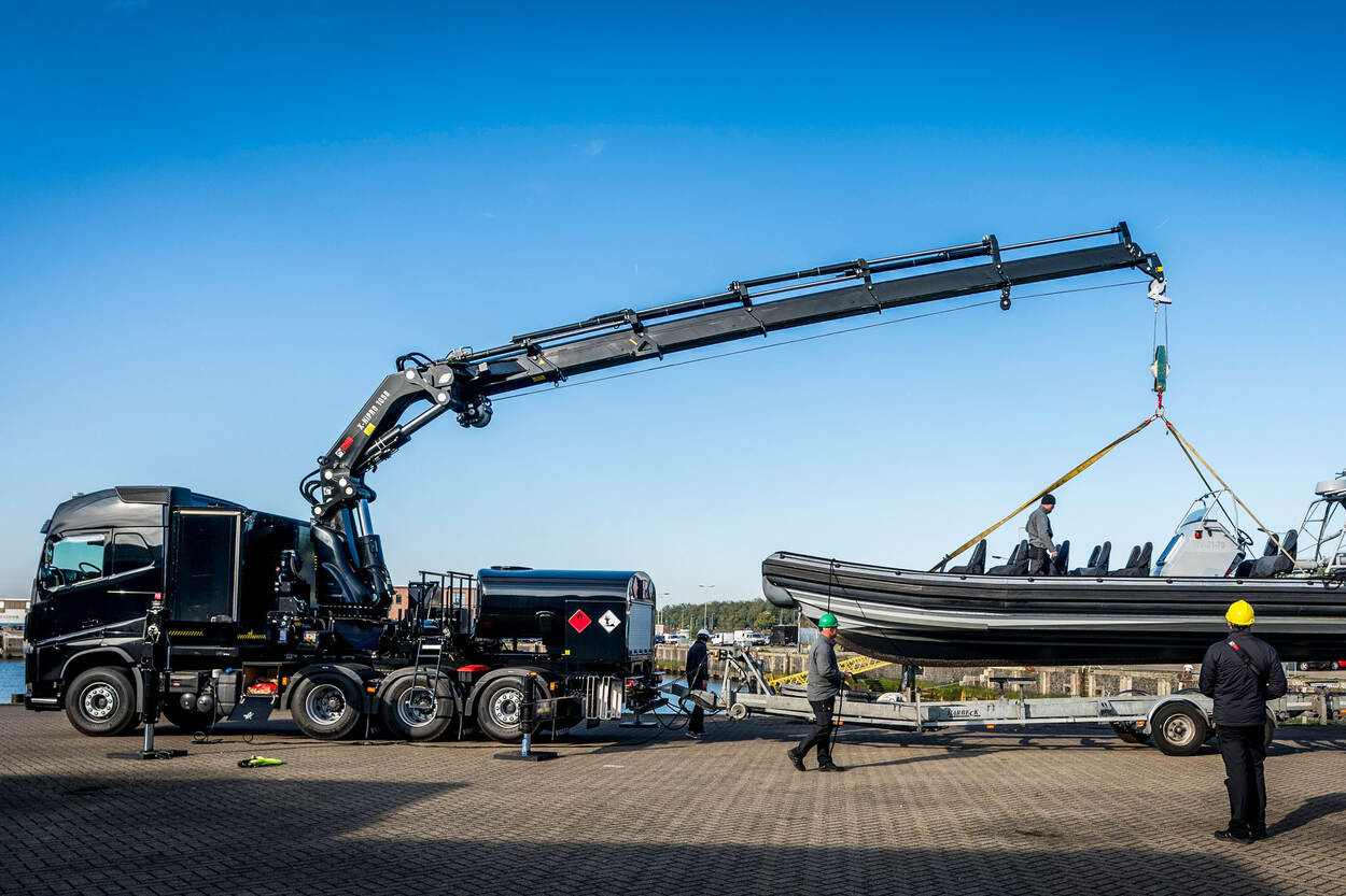 “Voorheen moesten we met een vrachtwagen, aanhanger en een aparte takelwagen naar de kade om 1 boot te kunnen lanceren”, legt opperwachtmeester Arjan uit. “Dat kon maar op een beperkt aantal plekken in Nederland, omdat het bereik van de kraan niet verder ging dan 5 meter. Nu kunnen we zo’n beetje overal de boten te water krijgen. En dat maakt ons een stuk flexibeler.”