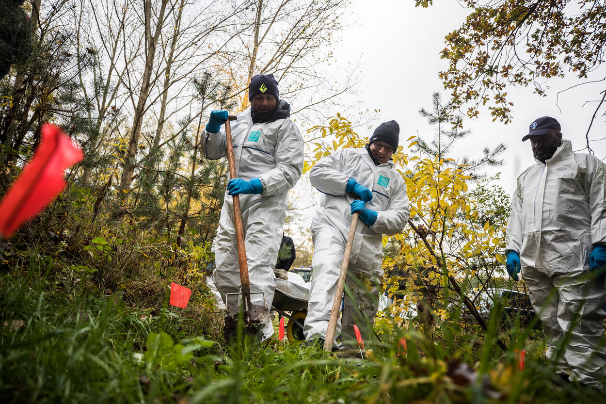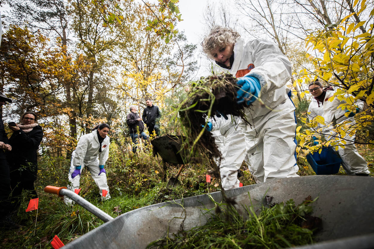 Een onalledaags beeld op de Prinses Margrietkazerne in Wezep. Mensen in witte pakken banen zich een weg door de struiken achter een van de kazernegebouwen. Uiterst nauwkeurig bekijken ze het drassige terrein, op zoek naar een graf. De Forensische Opsporing van de Koninklijke Marechaussee zocht mee.