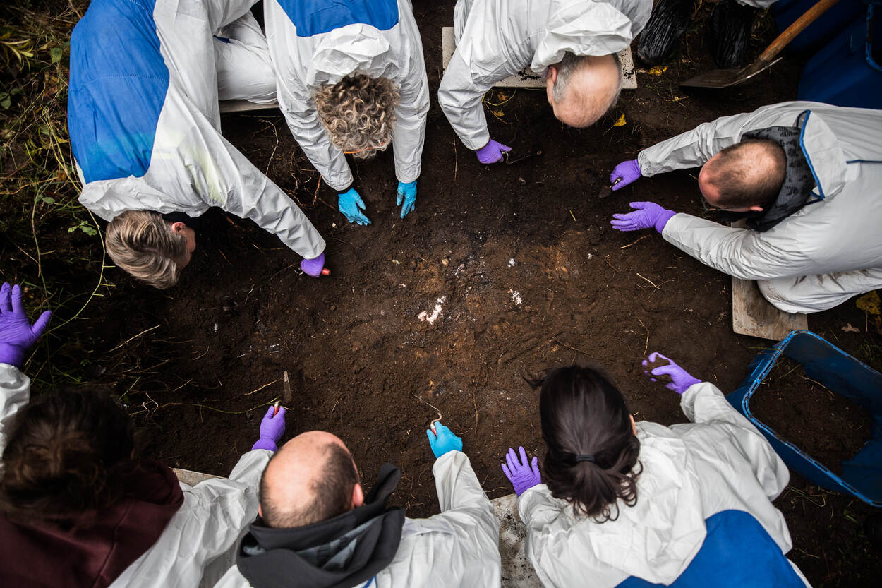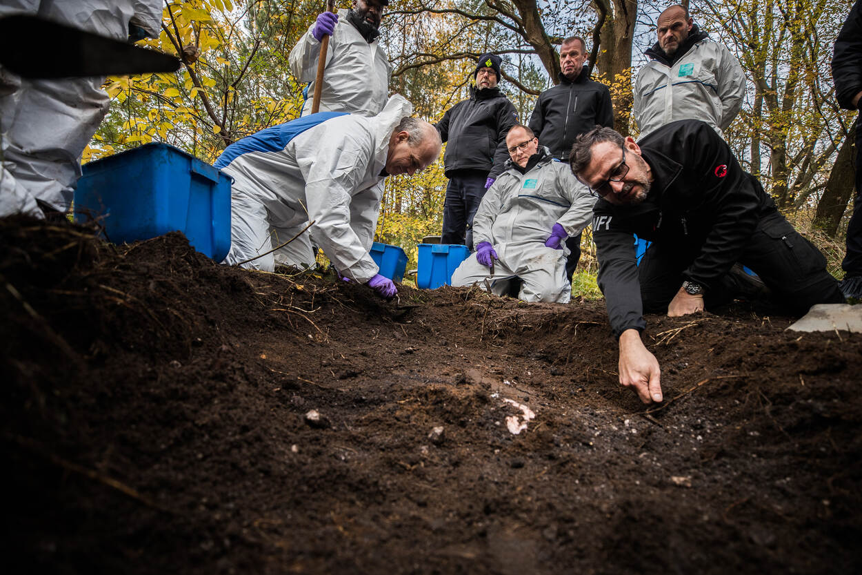 2 aangeklede poppen, 2 nepskeletten, enkele kogelhulzen en een graafmachine. Met dat opmerkelijke arsenaal arriveerde de oefenleiding afgelopen voorjaar op de landmachtkazerne in Wezep om de oefening alvast in de steigers te zetten. In totaal prepareerden ze 4 graven in verschillende settingen: in een zandwal, op beton in de grond met een gangenstelsel eronder, in droge poedergrond onder een dennenboom én in een drassig stuk grond. Aan de forensische experts van de betrokken partijen de taak om de graven te vinden, bloot te leggen, bewijsstukken op te graven en veilig te stellen.