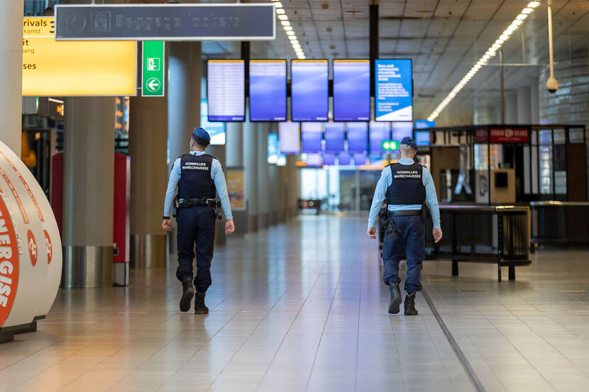 Vanwege COVID-19 is het rustig op Schiphol. Heel rustig zelfs. KMar-collega’s van de brigade Politie en Beveiliging maken een ronde over Schiphol Plaza.