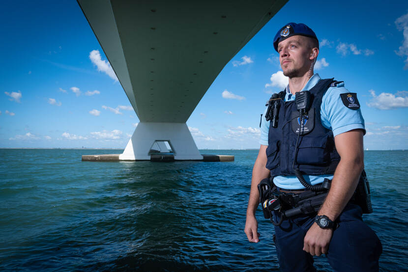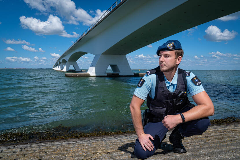 “Voor een controle van scheepvaart of visserij gaan we niet zo vaak over de Zeelandbrug. Op die bewuste dag kwam het zo uit. We hadden geen concrete opdracht en kozen ervoor richting Zierikzee te rijden en vervolgens via de Oosterscheldedam richting het eiland Neeltje Jans. In de jachthaven meren geregeld schepen aan die van de Noordzee komen en dus gecontroleerd moeten worden. Tot zover een gewone werkdag. Tot we een melding over het politiekanaal kregen dat een vrouw mogelijk van de Zeelandbrug wilde springen. We reden op dat moment net op de brug, maar zagen nog niets. Tot de automobilisten voor ons begonnen af te remmen. Zij reageerden op het stilstaande verkeer op de rijstrook richting Goes dat de vrouw reeds had opgemerkt. Toen we naar links keken, bleek dat we precies op de plek waren waar de vrouw stond: midden op de brug. Vanaf dat moment leken de minuten meer op seconden. We stopten en holden naar de rand. Om bij haar te komen, moesten we eerst nog over een hoge betonnen afscheiding klimmen die de rijbaan van het fietspad scheidt. Pas toen hadden we goed zicht op de situatie. 3 omstanders waren op enkele meters afstand met haar in gesprek. We naderden hen, toen in een oogwenk een van de mannen naar voren sprong en de vrouw bij haar bovenarmen greep. De vrouw was al over het hekwerk geklommen. Met haar voeten stond ze op de betonrand en met haar handen achter haar rug hield ze de reling vast."